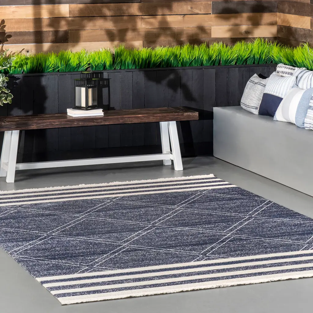 Diamonds And Stripes Fringe Indoor/outdoor Rug | Navy - 6' 7" X 6' 7"