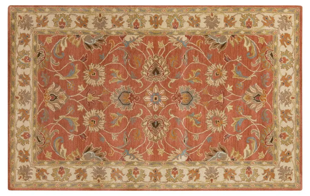 This traditionally inspired rug is tufted by hand using only the finest wool. Its elegant palette features tones of red clay, beige, bronze, ochre, and slate blue. A rug pad is recommended to keep this securely in place.