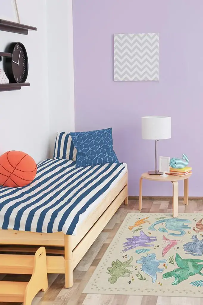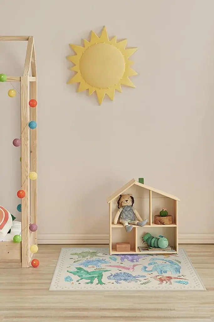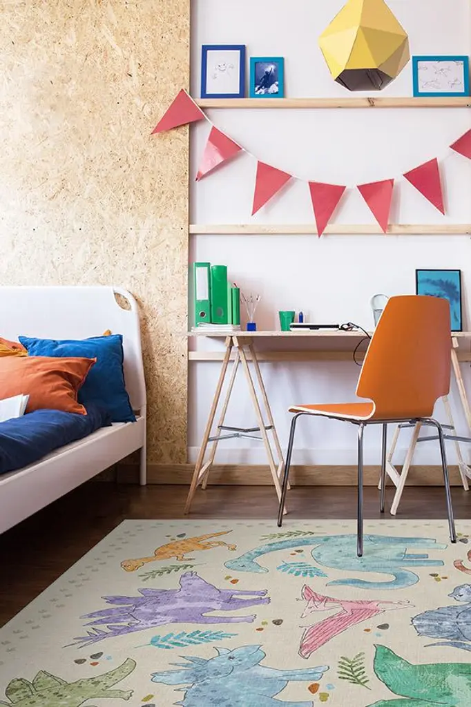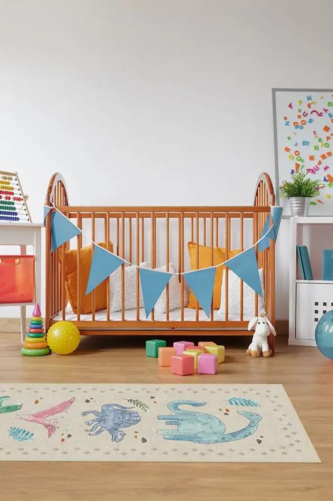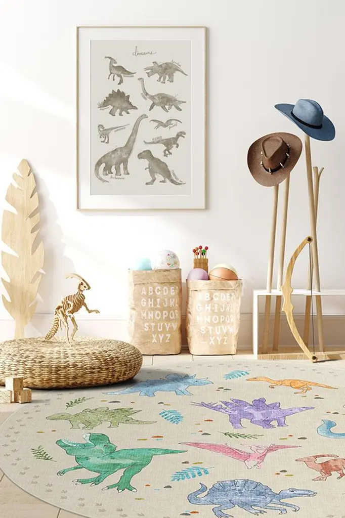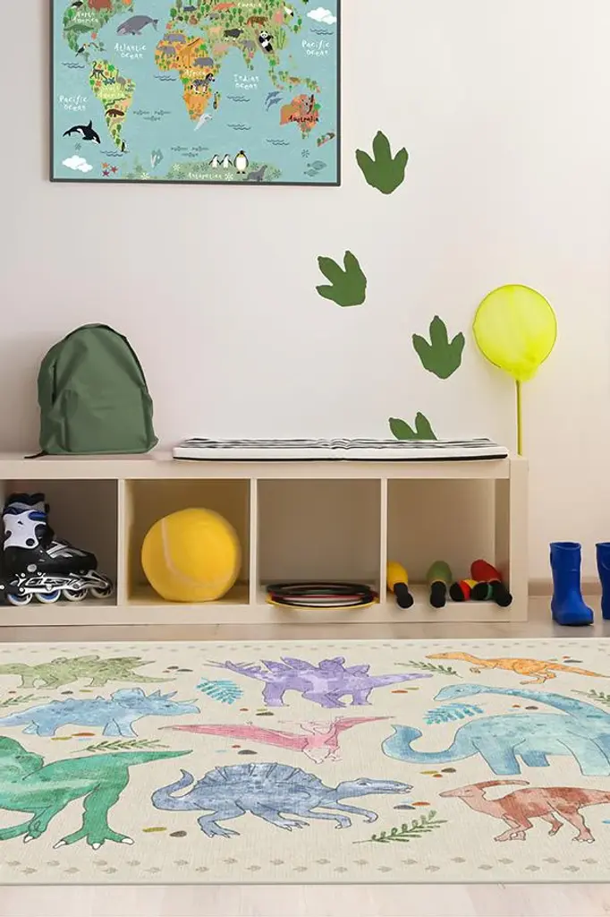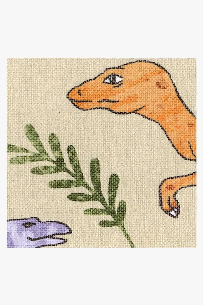 We're celebrating our favorite prehistoric creatures with the Dinosaur Parade Multicolor Rug. Pastel watercolors give this design a textural effect, while dino footprints flank the border for added oomph. Featuring an all-star cast of baby dinosaurs - pterodactyl, T. rex, triceratops, brontosaurus, parasaurolophus, stegosaurus, velociraptor, and spinosaurus, this fun rug brings a classic Jurassic look to any child's space.
