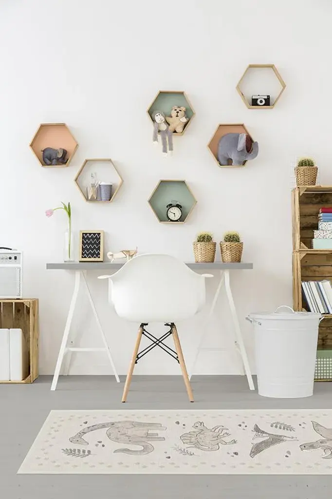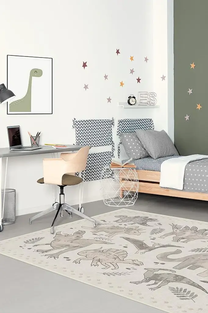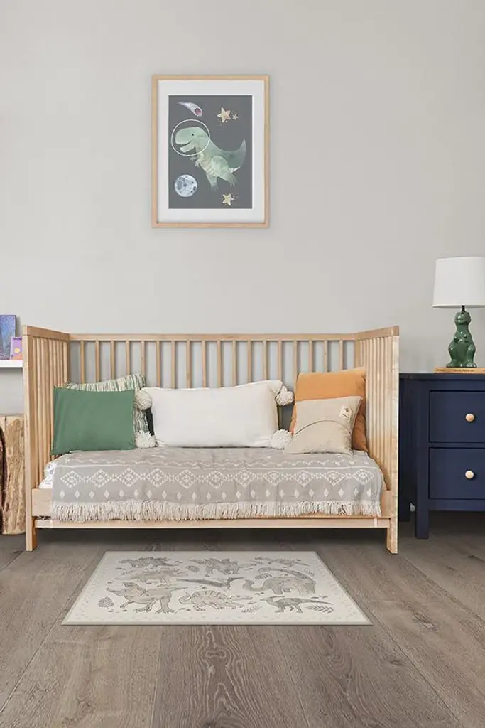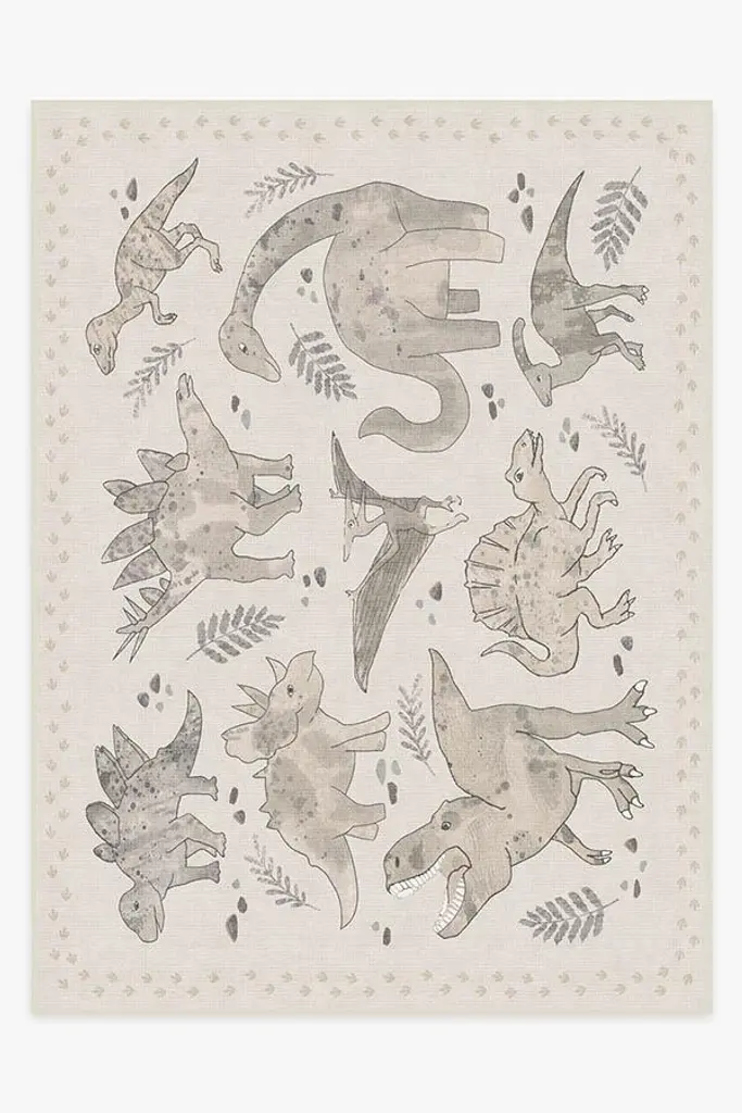 Our Dinosaur Parade Warm Grey Rug will make your child roar with delight. Washed in watercolor hues of neutral grey, this kids rug showcases a herd of baby dinosaurs, including a pterodactyl, T. rex, triceratops, brontosaurus, parasaurolophus, stegosaurus, velociraptor, and spinosaurus. A footprint border finishes the Jurassic look to bring adventure and fun to any playroom or nursery.