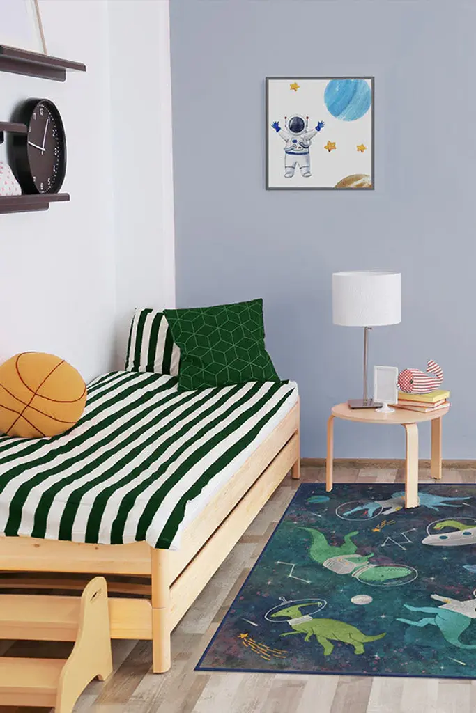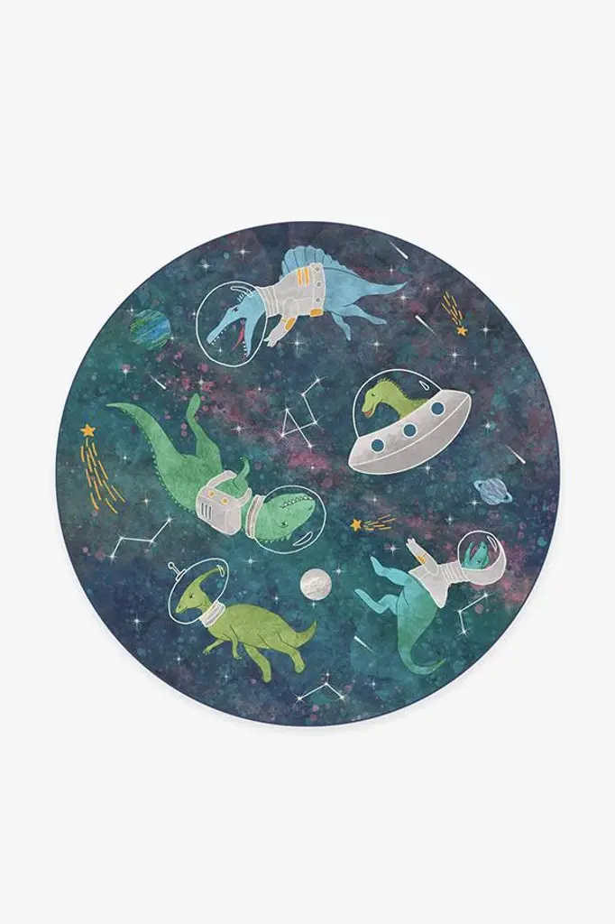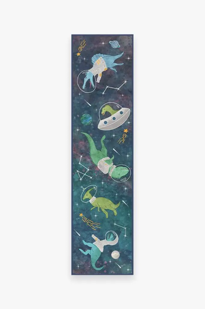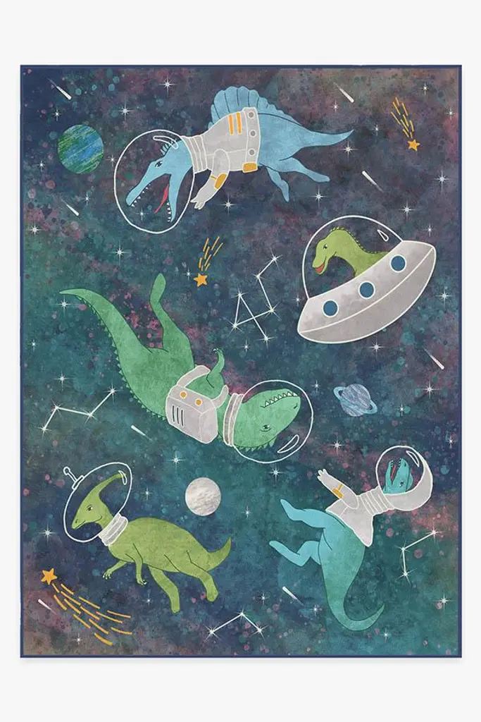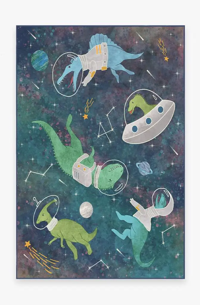 Dinosaurs have taken to the stars in our Dinosaurs in Space Rug. Whimsically drawn dinos in spacesuits float upon a galaxy of planets, shooting stars, the moon, and constellations. Rendered in textured tones of leaf green, turquoise, navy blue, and neutral grey, this kids' room rug will surely delight your little astronaut or science buff.