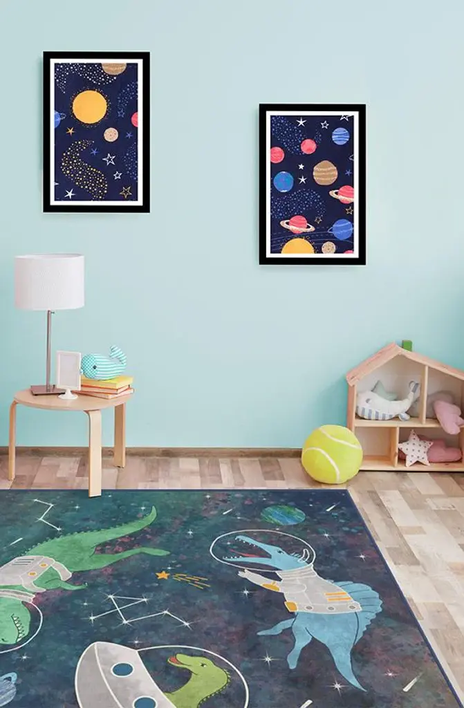 Dinosaurs have taken to the stars in our Dinosaurs in Space Rug. Whimsically drawn dinos in spacesuits float upon a galaxy of planets, shooting stars, the moon, and constellations. Rendered in textured tones of leaf green, turquoise, navy blue, and neutral grey, this kids' room rug will surely delight your little astronaut or science buff.