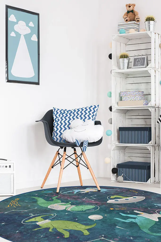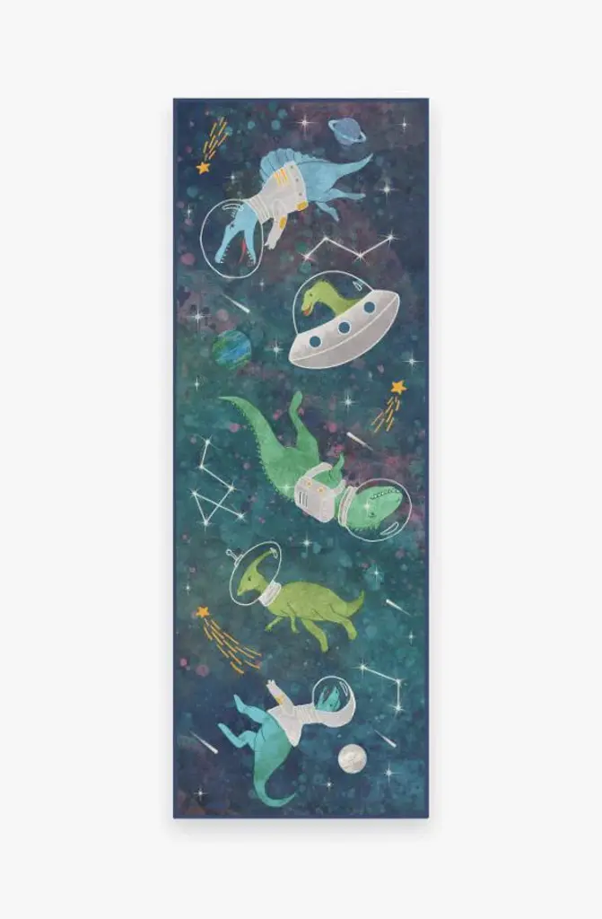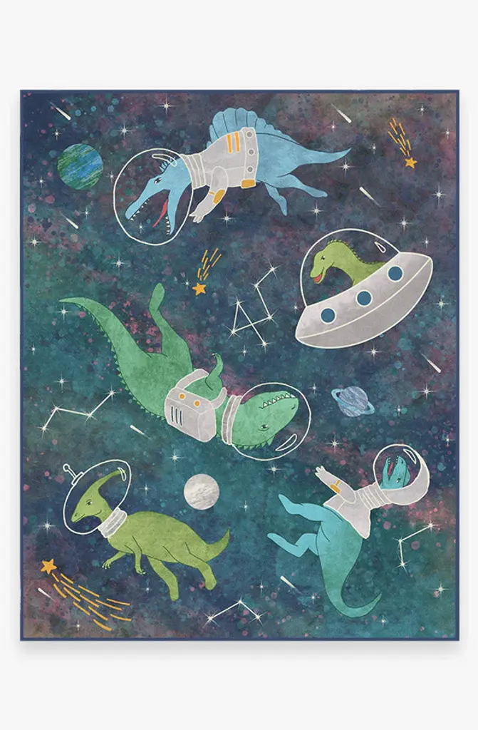 Dinosaurs have taken to the stars in our Dinosaurs in Space Rug. Whimsically drawn dinos in spacesuits float upon a galaxy of planets, shooting stars, the moon, and constellations. Rendered in textured tones of leaf green, turquoise, navy blue, and neutral grey, this kids' room rug will surely delight your little astronaut or science buff.