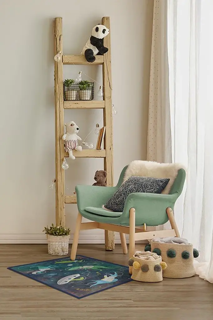 Dinosaurs have taken to the stars in our Dinosaurs in Space Rug. Whimsically drawn dinos in spacesuits float upon a galaxy of planets, shooting stars, the moon, and constellations. Rendered in textured tones of leaf green, turquoise, navy blue, and neutral grey, this kids' room rug will surely delight your little astronaut or science buff.