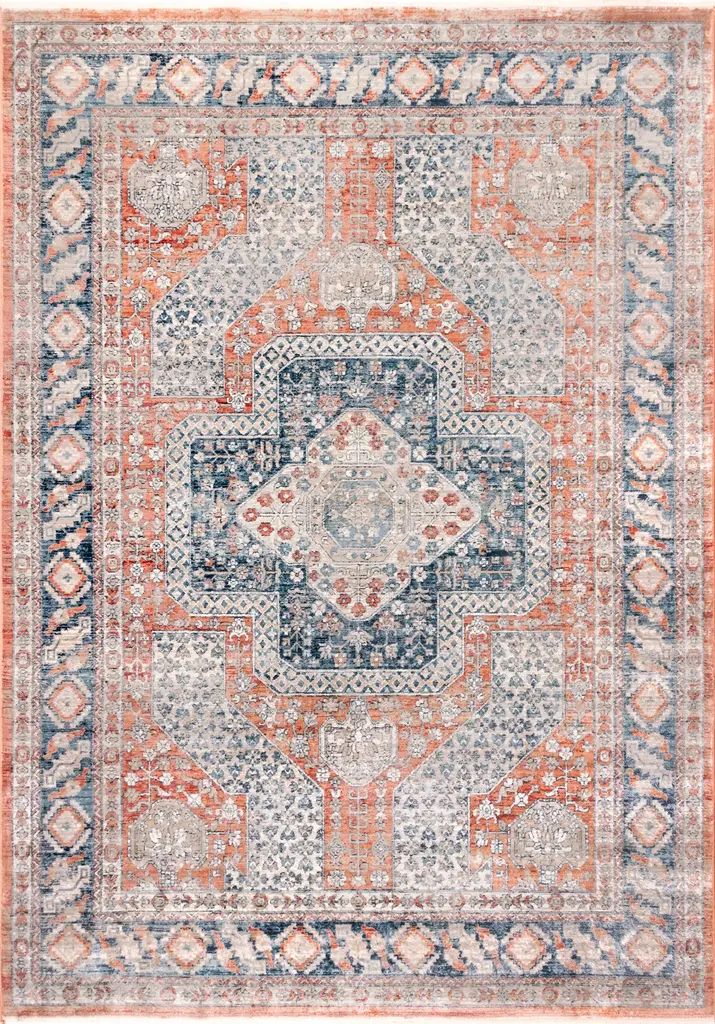This daring and distressed Turkish rug brings effortless style to any room. Machine made from powerloomed materials, it will hold up beautifully to everyday use. Choose from a wide array of colors and sizes. The perfect blend of a classic traditional pattern and a stylish twist, this carpet makes the perfect covering for bringing your space together. Make the most of your time at home with our pet-friendly and easy to clean area rugs.