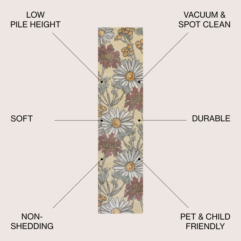 Layer on the cottage garden style with this lively rug's all-over floral design. The graphic wildflower pattern gives vintage botanical prints a modern vibe. Easy-care low pile and a busy pattern make this pet-friendly rug perfect for a bedroom, living room, kitchen, or dining area.