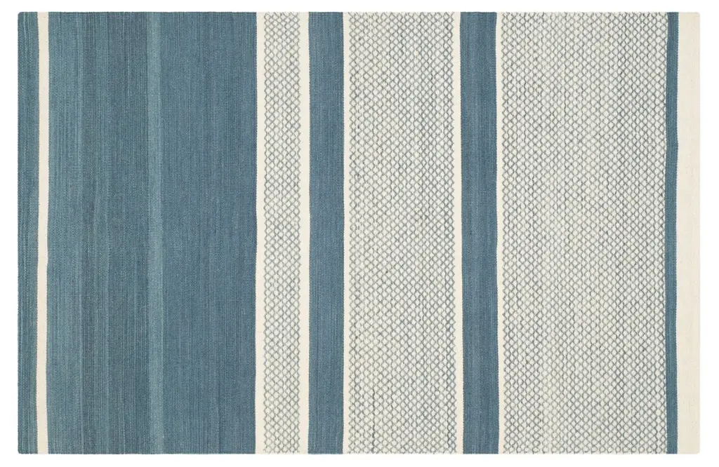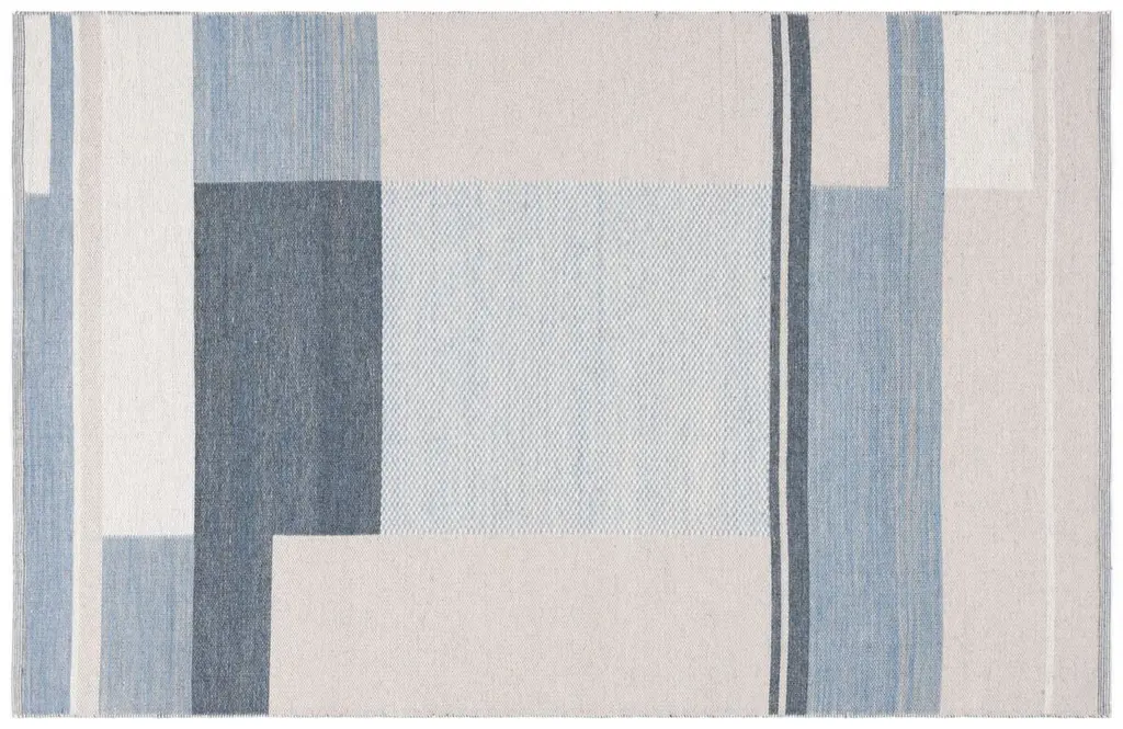 Introducing our exquisite Contemporary-style area rug that embodies sophistication and modern living. Designed to seamlessly integrate into your living space, this 3' X 5' small rectangle rug features a dynamic blend of beige and blue tones, creating an inviting atmosphere in any room. Crafted in India with precision, this piece boasts a machine-woven construction that ensures both durability and subtle texture, perfect for high-traffic areas or cozy nooks alike. With a low pile height of 1/4", it offers a sleek look and easy maintenance without sacrificing comfort. Made from a luxurious mix of materials, our rug comprises 90% wool for softness and 10% polyester for added resilience, giving you the best of both worlds in terms of feel and longevity. Embrace the harmonious geometric pattern inspired by the image, where clean lines and balanced rectangles come together to form a captivating design. Whether placed in your living room, bedroom, or study, this area rug is sure to make a statement and complement your existing decor with its versatile color palette and refined aesthetics.