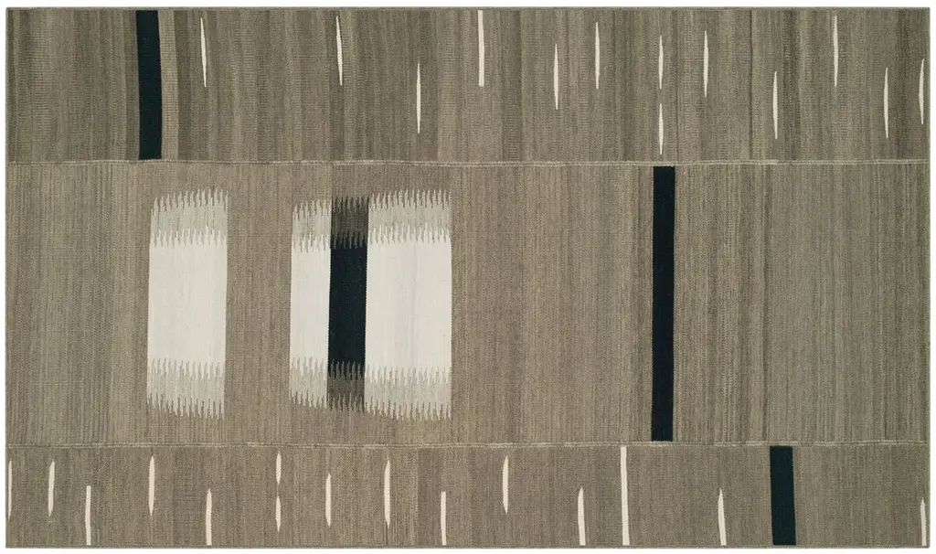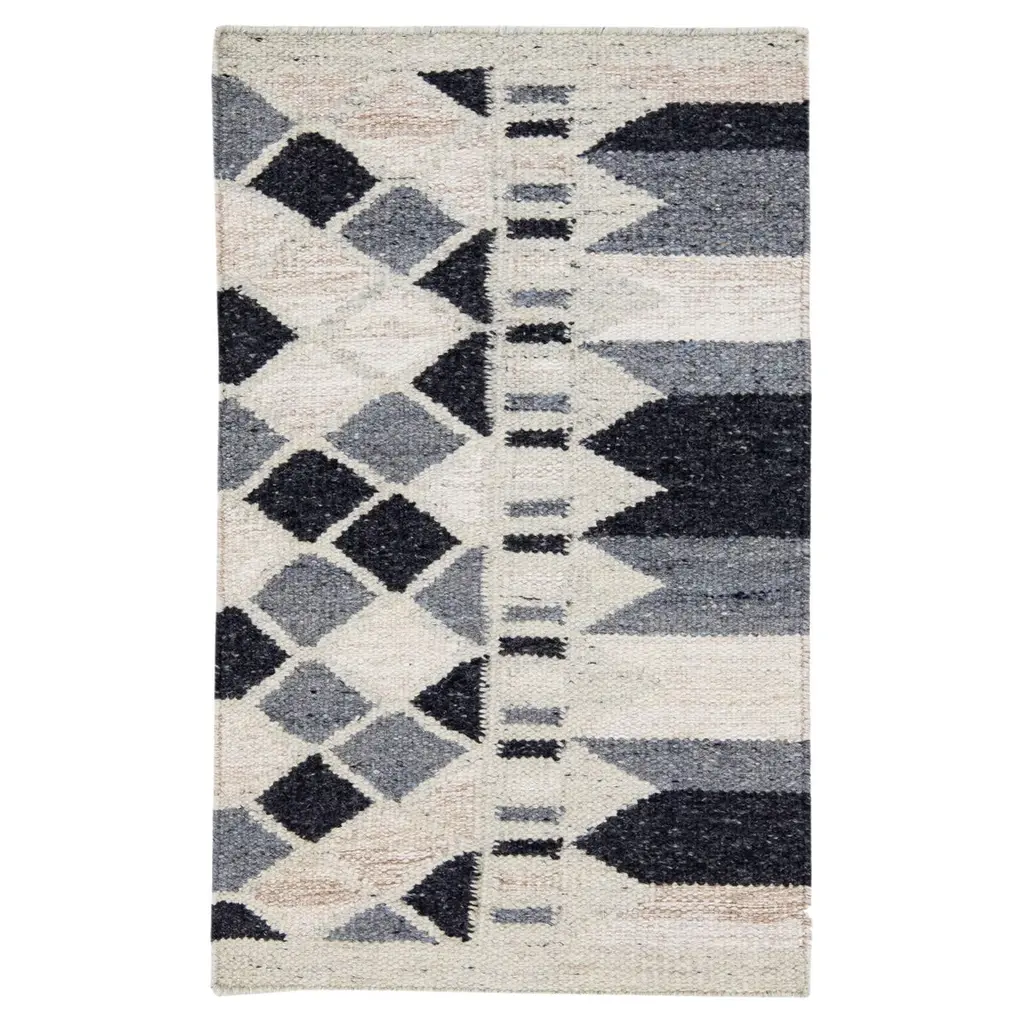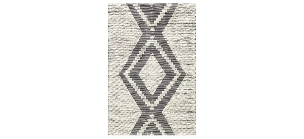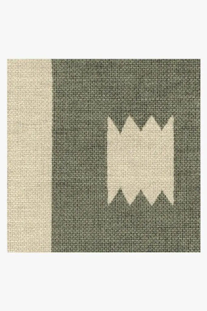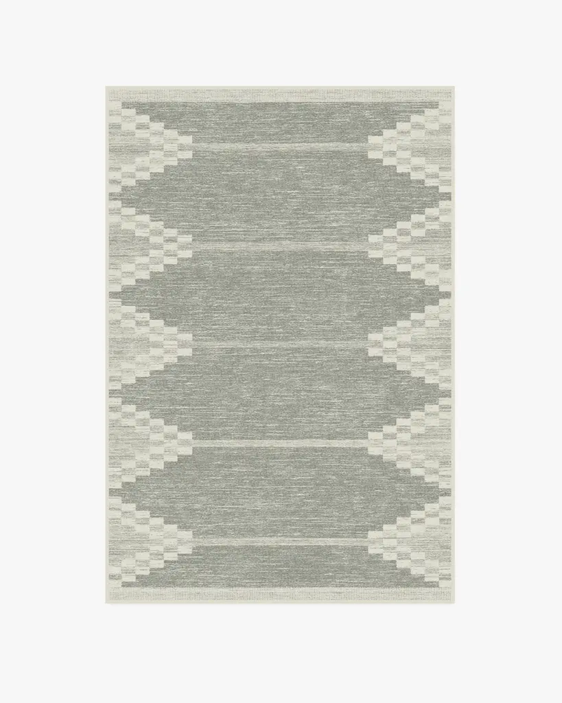 Domo Sage Rug was designed to mimic the facade of pueblo-style homes in the Southwest. Geometric patterns and color blocking create this mirror-image design, tinted in soft hues of sage and cream.
