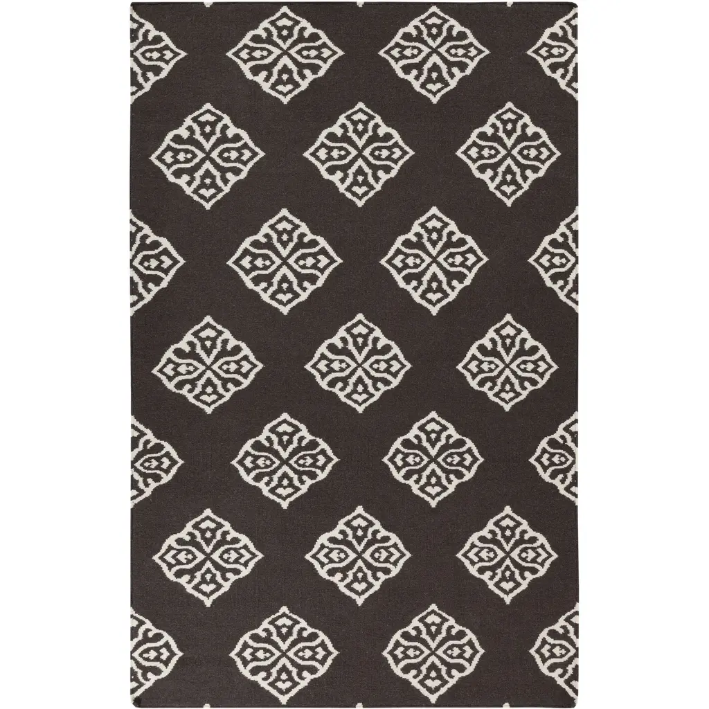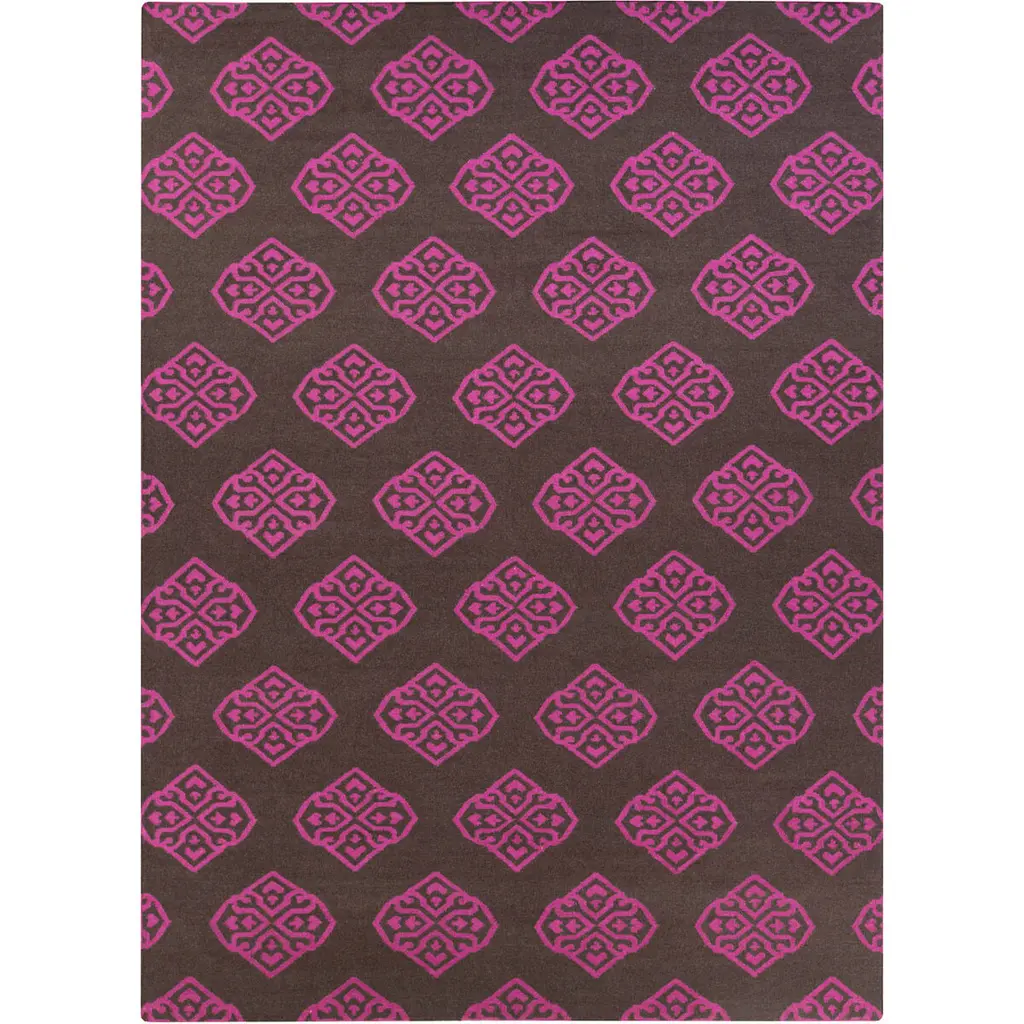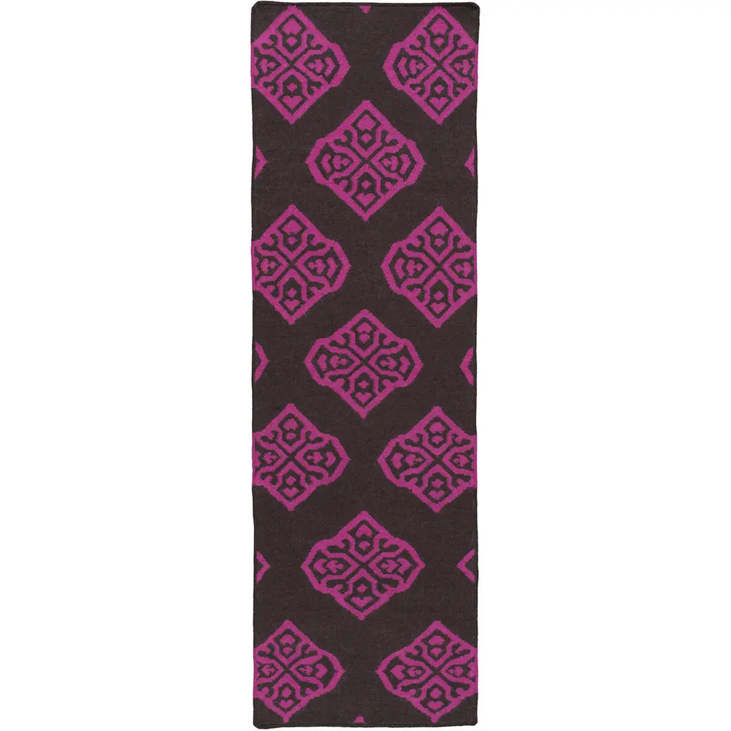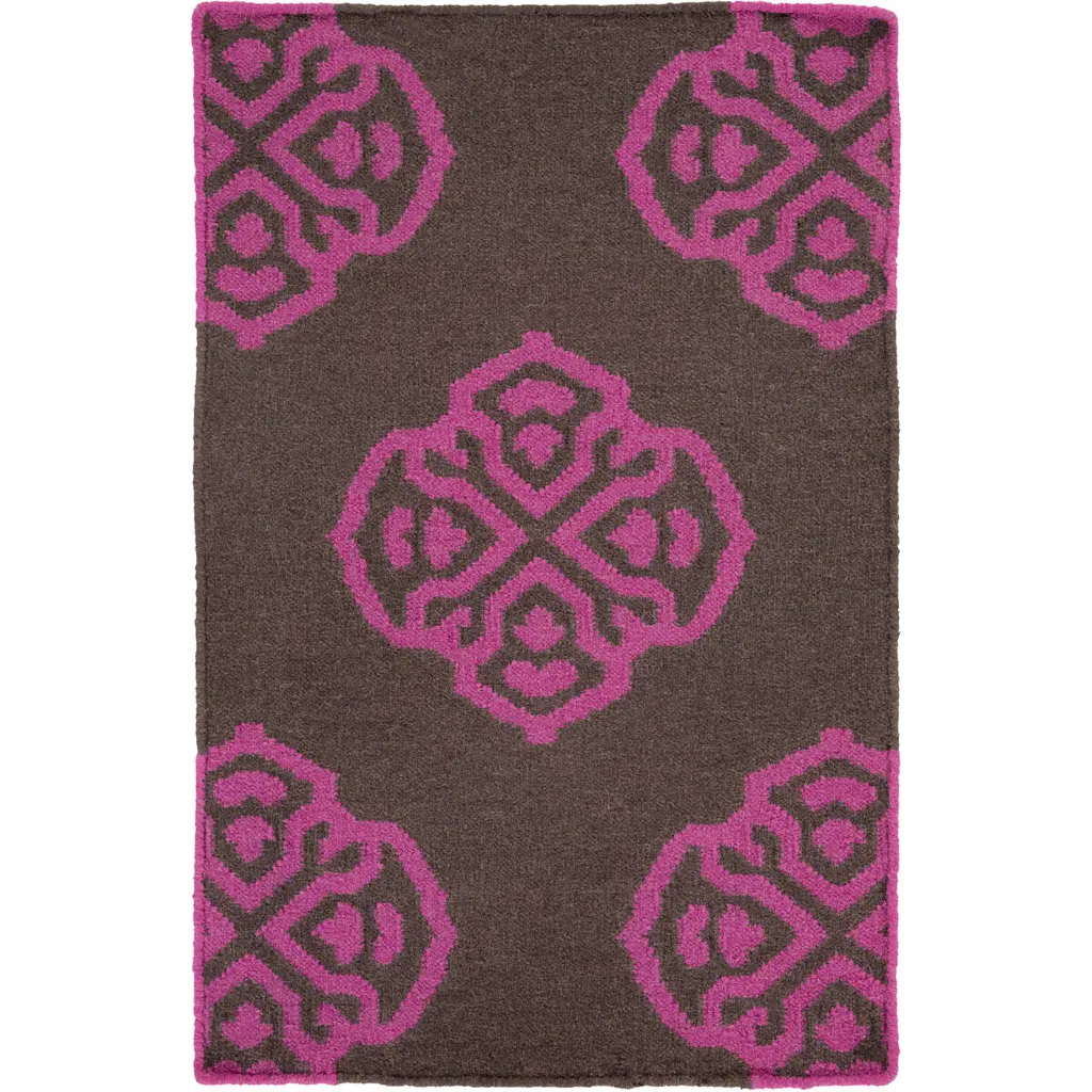 Collection: Doran Colors: Dark Brown, Medium Purple Construction: Hand Woven Material: 100% Wool Pile: No Pile Styles: Contemporary Made In: India Thickness: 0.16" Price Range: $$$$$ (Most Affordable)