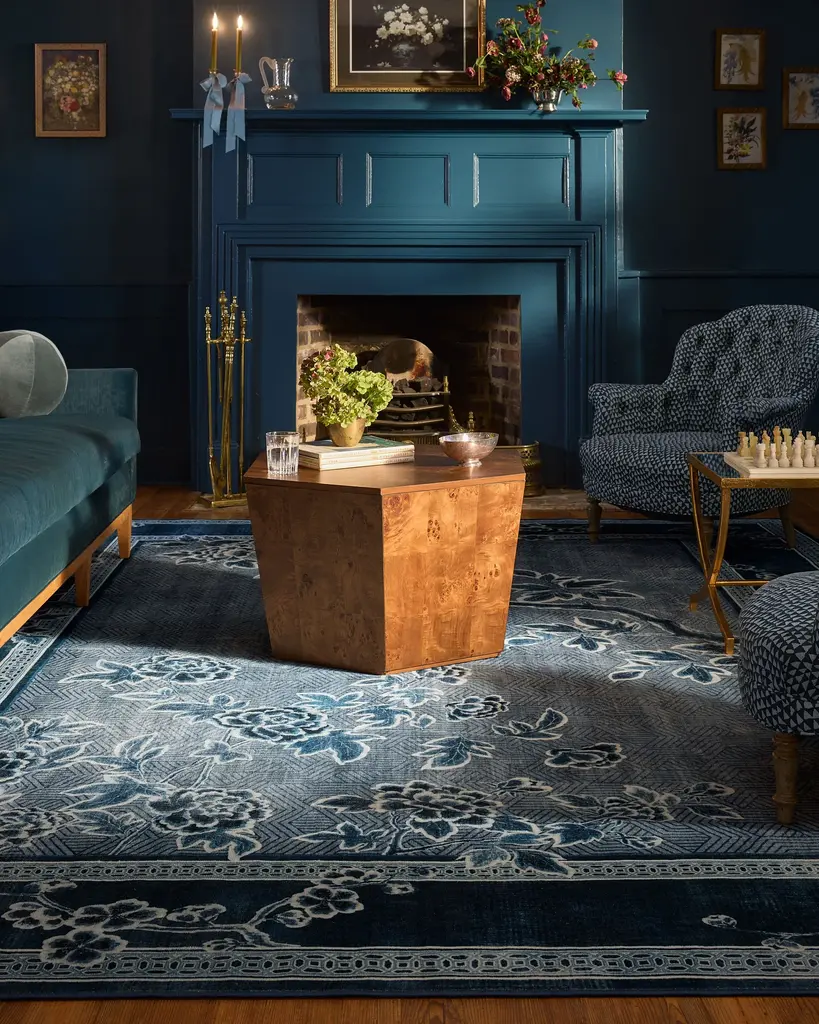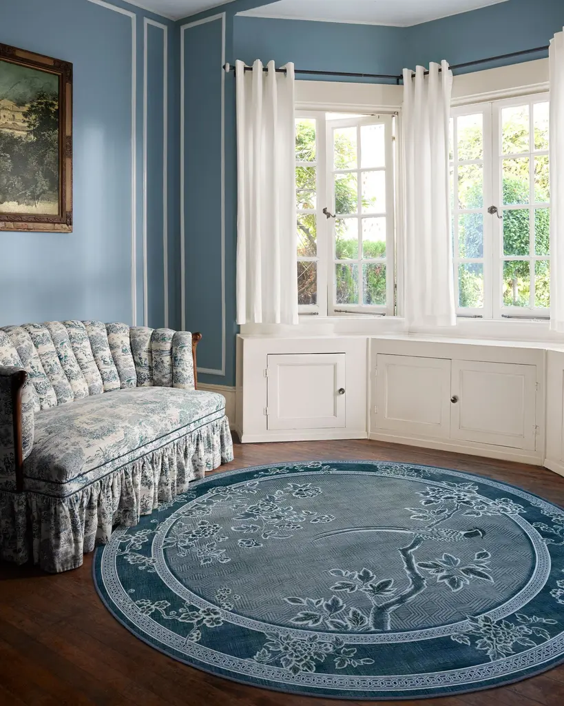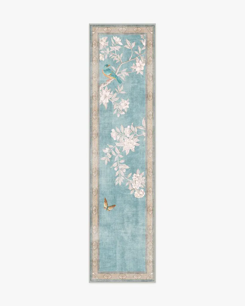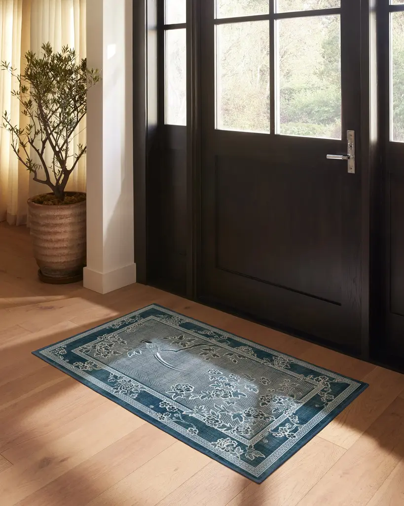 Inspired by handpainted Chinese landscape paintings, our Gracie Draper Blue Rug features bold floral and bird motifs with an antique feel. Subtle patterning appears in the border, enhancing the illusion of an infinite landscape. Its palette of deep lapis blues, silvery-slate blues, and creamy whites blend beautifully, giving the pattern a delicate quality. Water-resistant, stain-resistant, and machine-washable. Rug colors may vary slightly according to your device and the lighting in your space.
