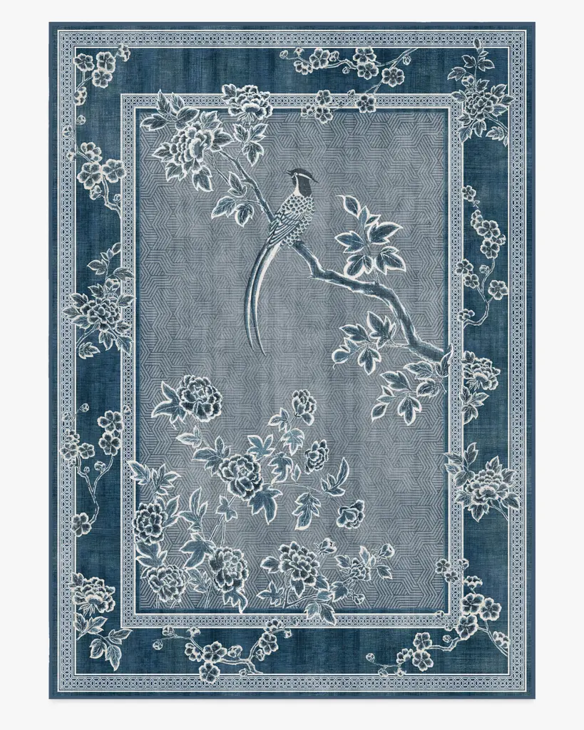 Inspired by handpainted Chinese landscape paintings, our Gracie Draper Blue Rug features bold floral and bird motifs with an antique feel. Subtle patterning appears in the border, enhancing the illusion of an infinite landscape. Its palette of deep lapis blues, silvery-slate blues, and creamy whites blend beautifully, giving the pattern a delicate quality. Water-resistant, stain-resistant, and machine-washable. Rug colors may vary slightly according to your device and the lighting in your space.