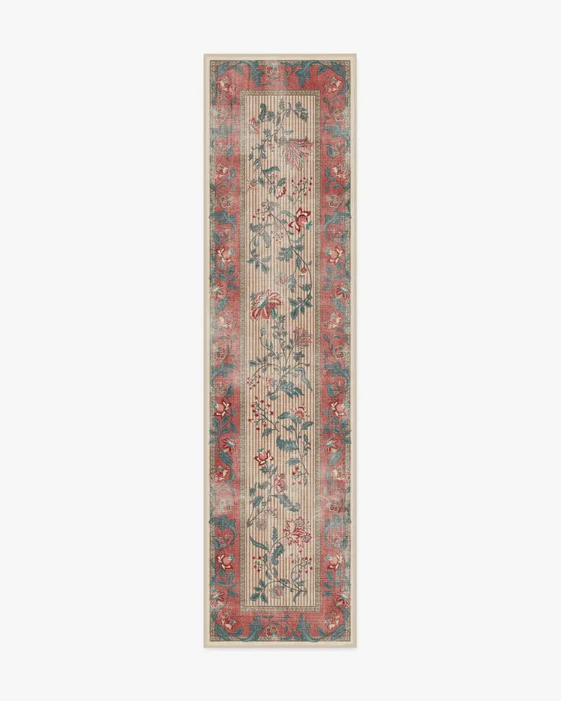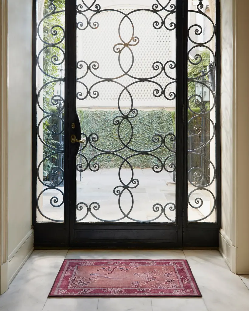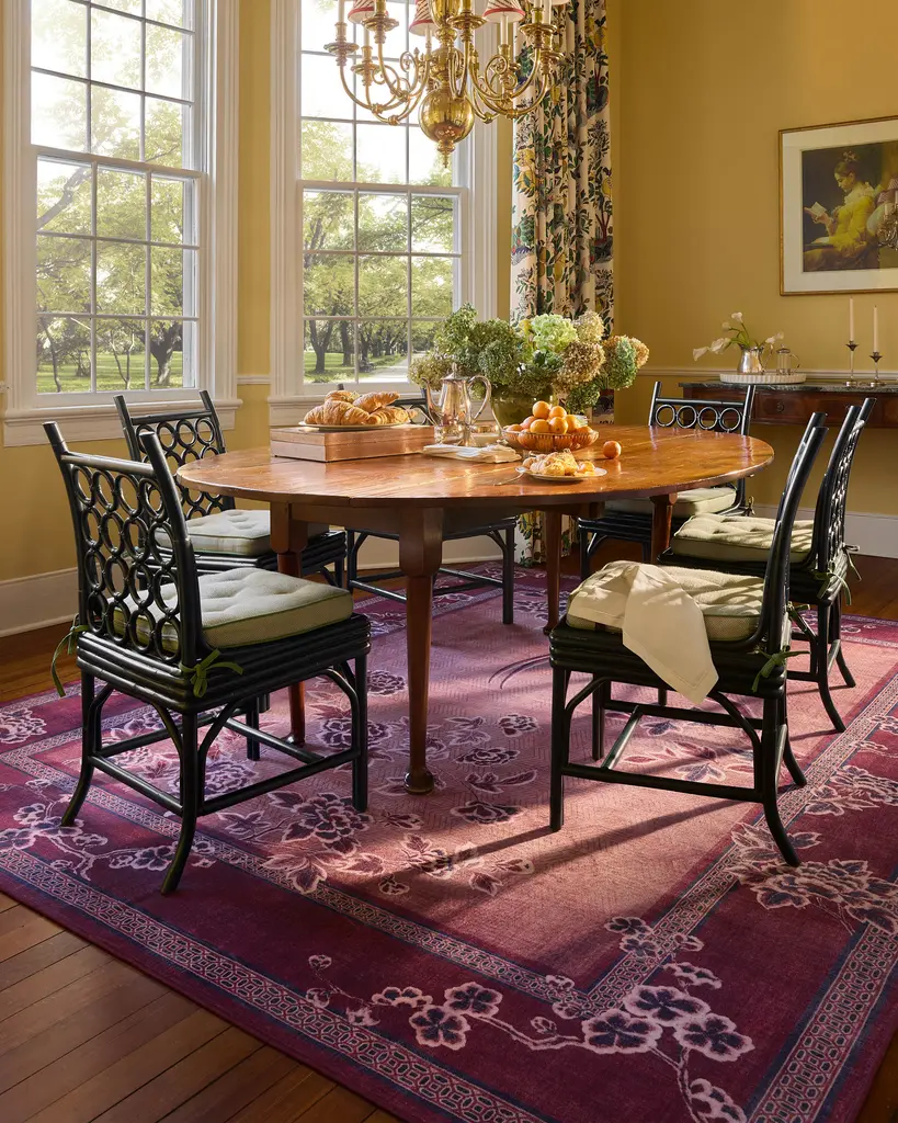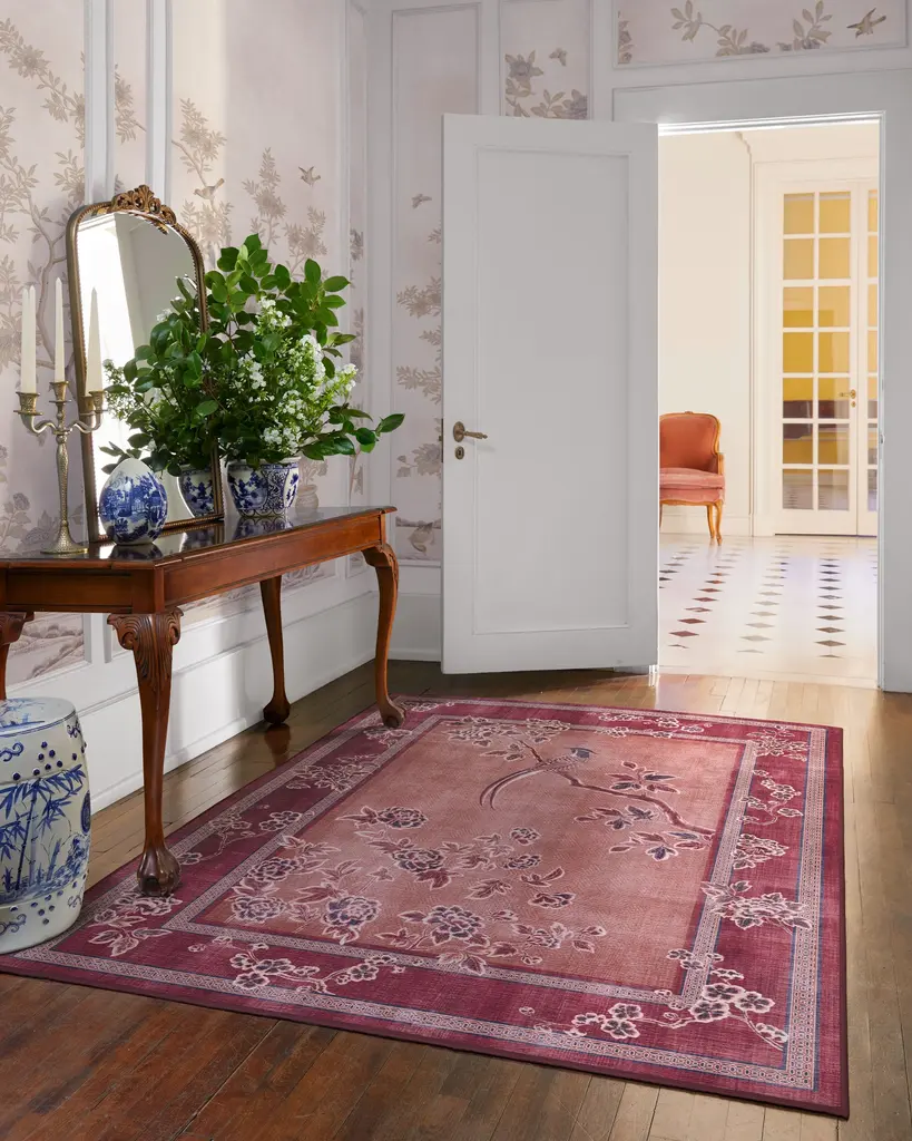 Inspired by handpainted Chinese landscape paintings, our Gracie Draper Burgundy Rug features bold floral and bird motifs with an antique feel. Subtle patterning appears in the border, enhancing the illusion of an infinite landscape. Its palette of rich berry, dark navy blue, palet dusty pinks, and alabaster whites blend beautifully, giving the pattern a delicate quality. Water-resistant, stain-resistant, and machine-washable. Rug colors may vary slightly according to your device and the lighting in your space.