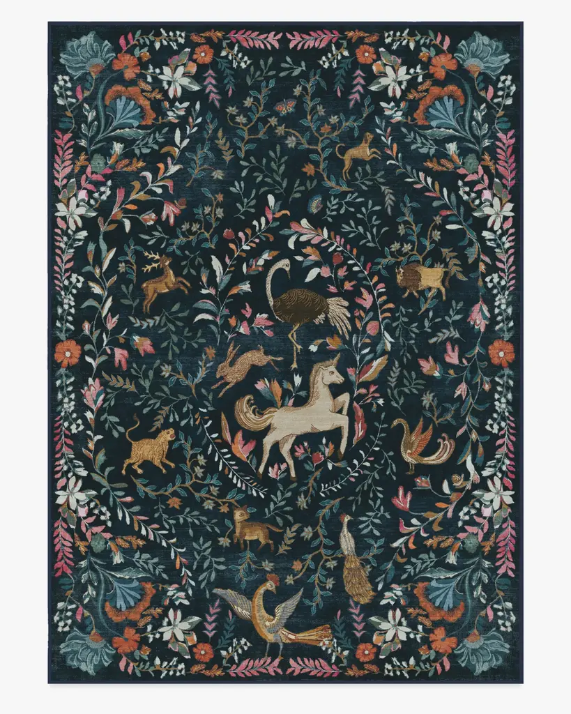 Unleash your inner unicorn with our Iris Apfel Dreamweaver Blue Multicolor Rug. Inspired by Iris' tendency to combine sophistication and fantasy, this dreamy tapestry design features whimsical flora and fauna in a plethora of azure hues. The rest of its dreamlike palette is complemented by blush pink, gold, verdigris green, cerulean blue, cream, and brown ��� all against a midnight blue background. Water-resistant, stain-resistant, and machine-washable. Rug colors may vary slightly according to your device and the lighting in your space.