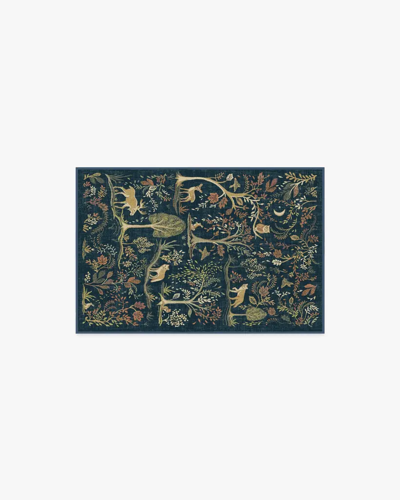 Unleash your inner unicorn with our Iris Apfel Dreamweaver Blue Multicolor Rug. Inspired by Iris' tendency to combine sophistication and fantasy, this dreamy tapestry design features whimsical flora and fauna in a plethora of azure hues. The rest of its dreamlike palette is complemented by blush pink, gold, verdigris green, cerulean blue, cream, and brown ��� all against a midnight blue background. Water-resistant, stain-resistant, and machine-washable. Rug colors may vary slightly according to your device and the lighting in your space.