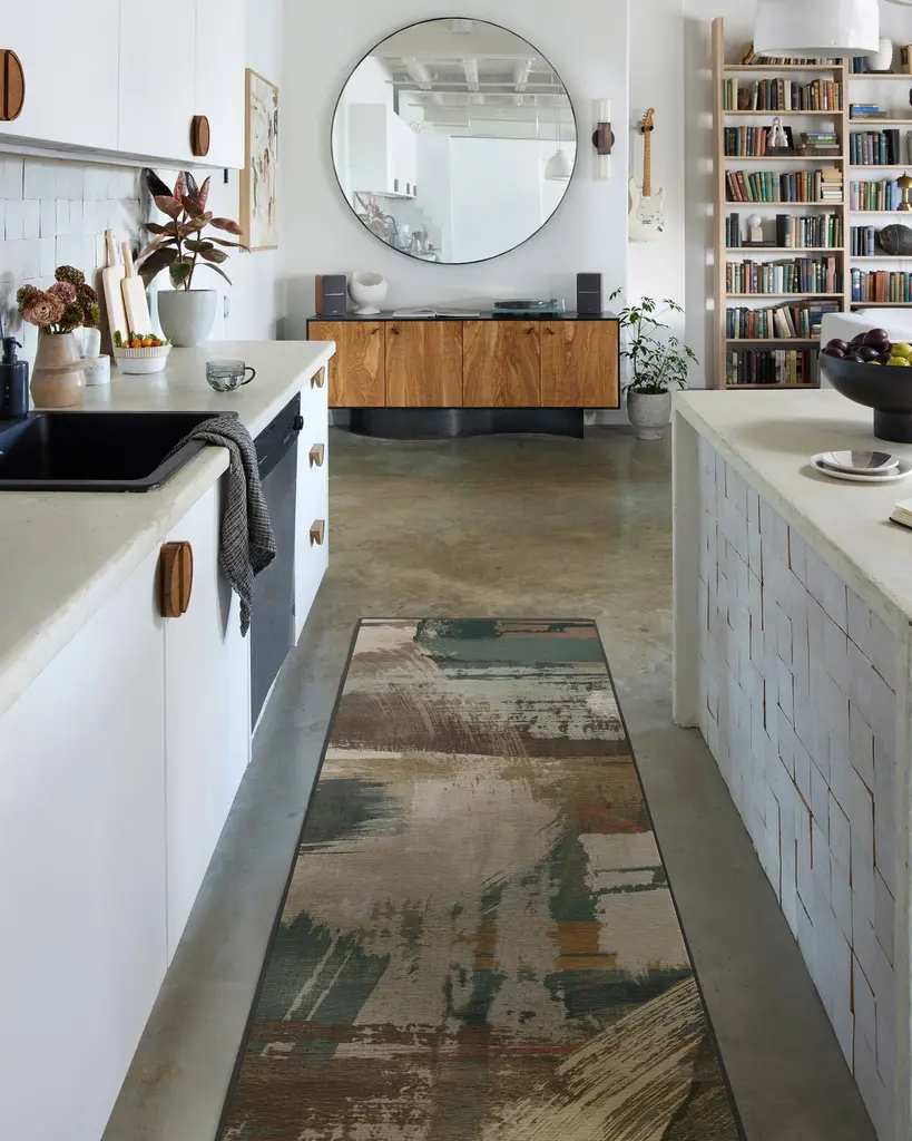 Bring home high-end design with our Architectural Digest Dresden Shadow Multicolor Rug. This industrial-inspired design features broad, painterly strokes of varying weights, engineered to create an abstract composition of movement and layering. Its balanced palette of warm and cool tones blends light creams and sages with dark teals and deep browns. Water-resistant, stain-resistant, and machine-washable. Rug colors may vary slightly according to your device and the lighting in your space.
