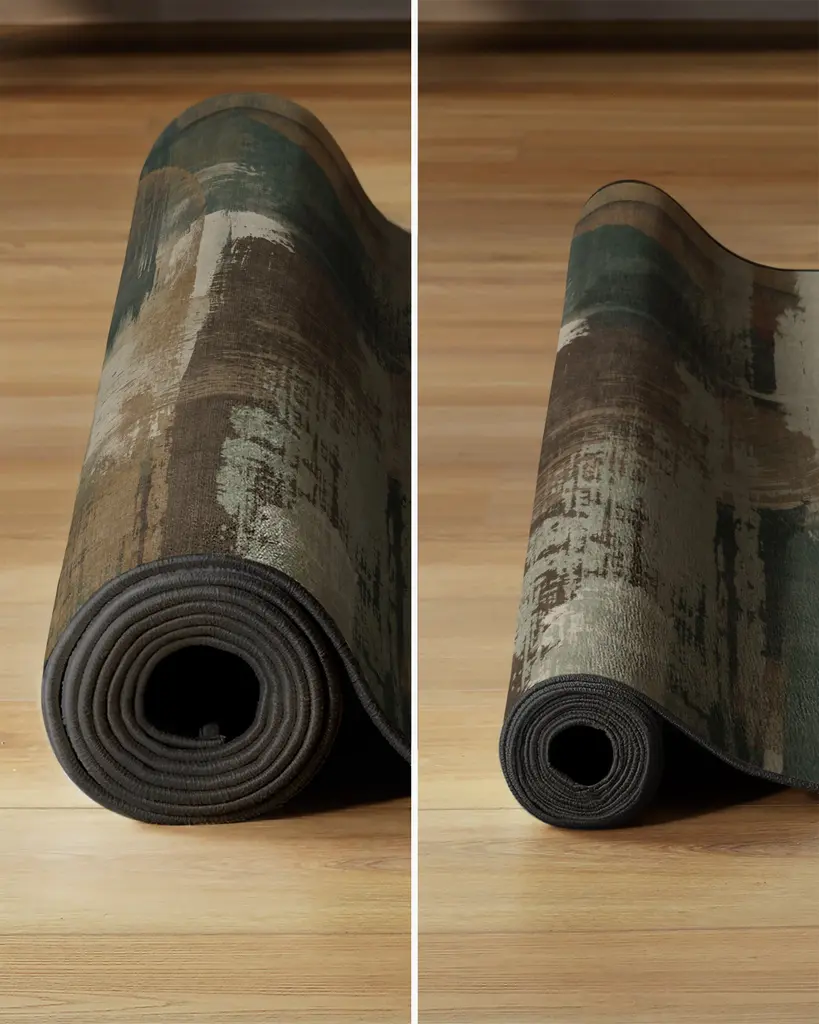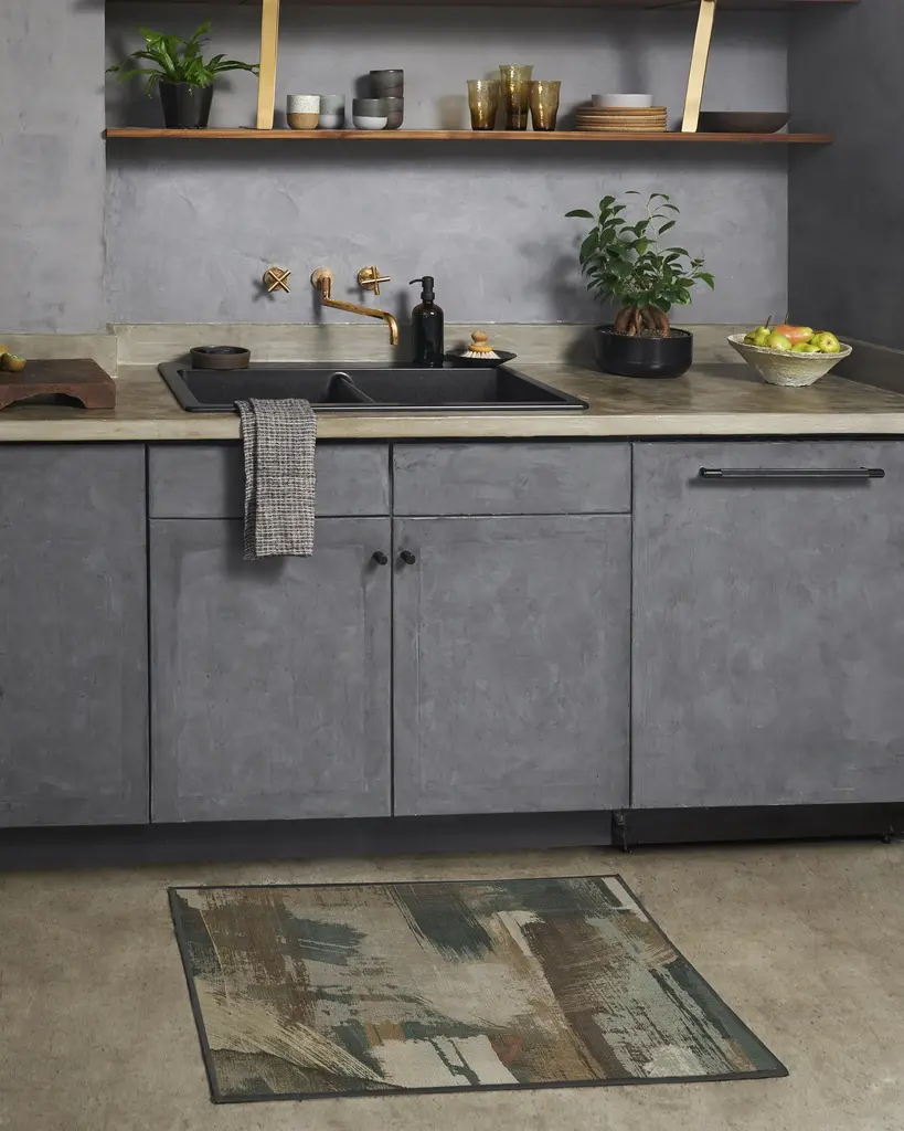 Bring home high-end design with our Architectural Digest Dresden Shadow Multicolor Rug. This industrial-inspired design features broad, painterly strokes of varying weights, engineered to create an abstract composition of movement and layering. Its balanced palette of warm and cool tones blends light creams and sages with dark teals and deep browns. Water-resistant, stain-resistant, and machine-washable. Rug colors may vary slightly according to your device and the lighting in your space.