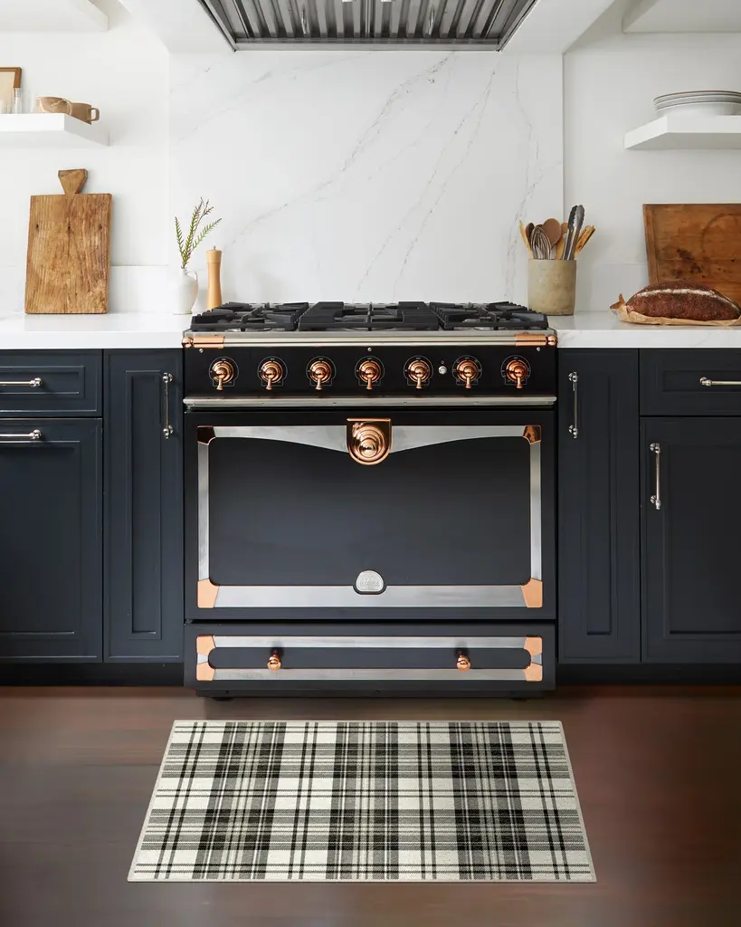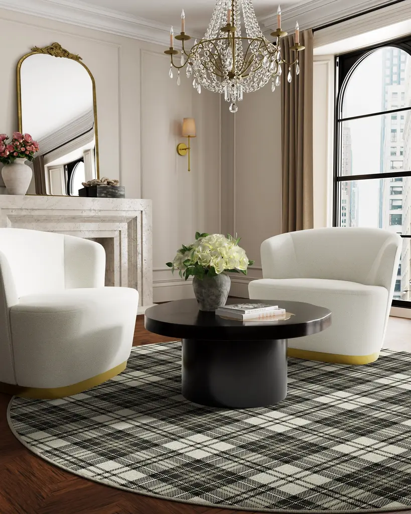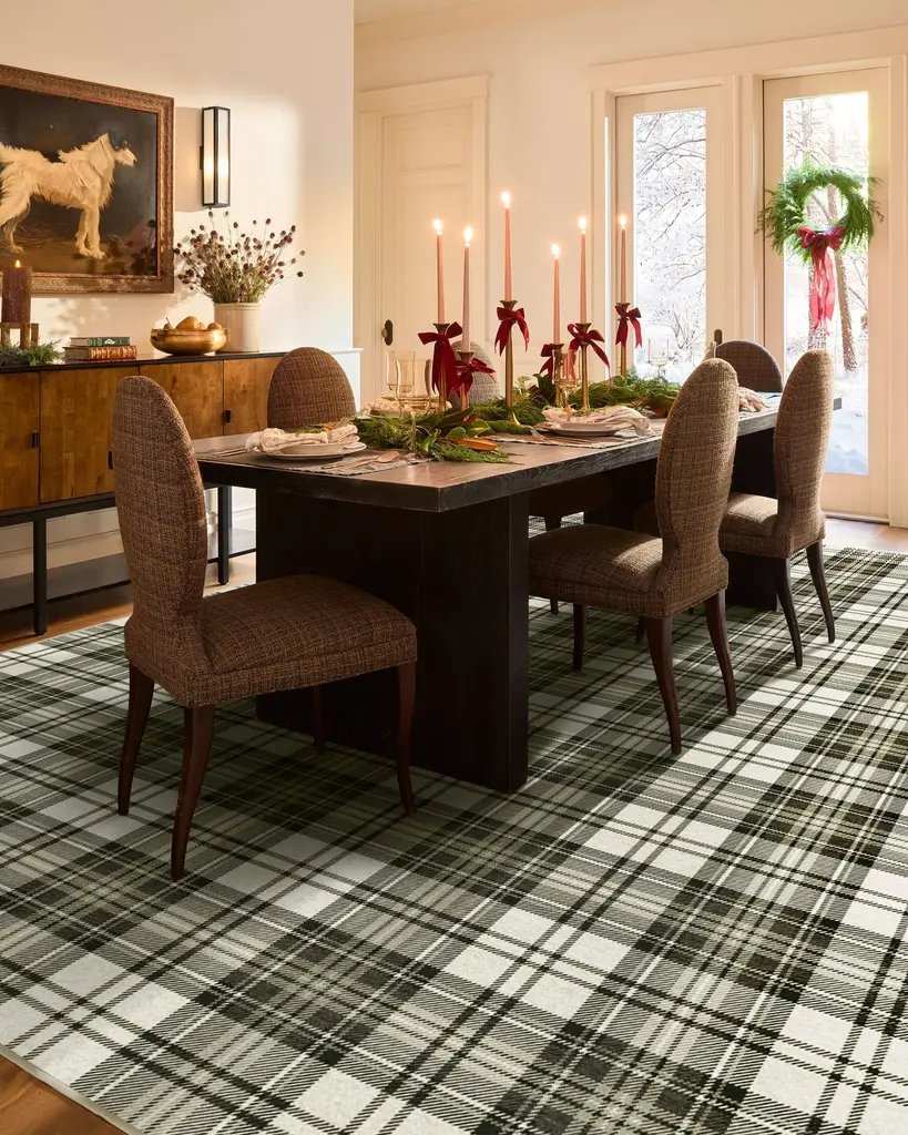 Wrap your home in warmth and holiday cheer with our Dress Stewart Tartan Black & Ivory Rug. Inspired by timeless tartan patterns, this festive plaid design features soft charcoals, deep blacks, and warm greys elegantly crisscrossing against a light ivory background. Water-resistant, stain-resistant, and machine-washable. Rug colors may vary slightly according to your device and the lighting in your space.