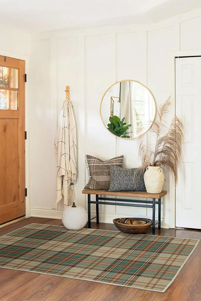 A timeless choice for any holiday home decor style. Our Dress Stewart Tartan Khaki Rug features a neutral oatmeal background accented by vibrant tangerine and teal blue lines for a subtle yet festive pop of color. Water-resistant, stain-resistant, and machine-washable.