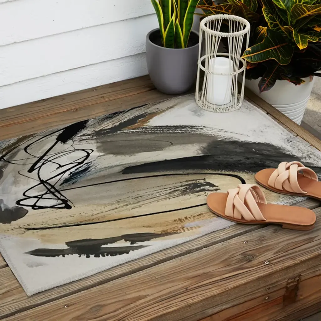Drift [5]: A Neutral Abstract Mixed Media Piece In Black, White, Gray, Brown Outdoor Rug