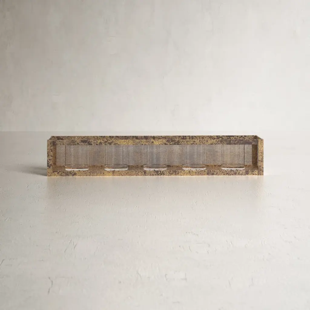 Three interlocking latticework panels become a console of great visual interest. Mango wood plank top. Driftwood finish. From a fashion forward perspective, Global Views offers accessories, furniture, statement lighting, and an assortment of rugs and mirrors to add beauty and joy to your home.