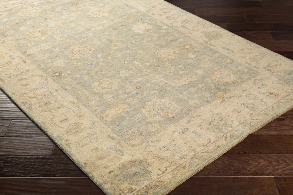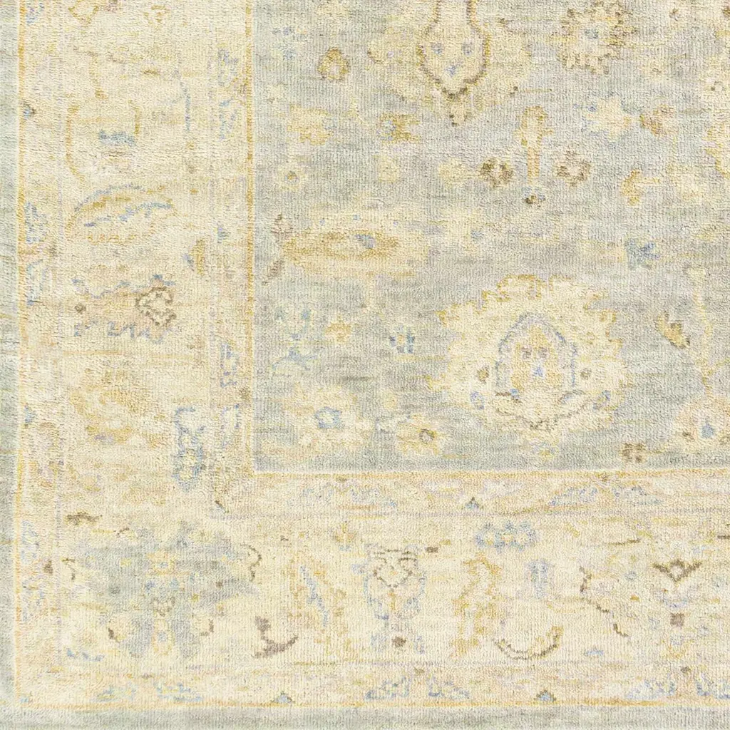Collection: Dunipace Colors: Beige, Blue, Medium Brown, Pale Blue, Taupe, Medium Gray Construction: Hand Knotted Material: 100% Wool Pile: Medium Pile Pile Height: 0.23" Styles: Traditional Made In: India Thickness: 0.31" Fringe Length: 0.5" Price Range: $$$$$ (Premium)