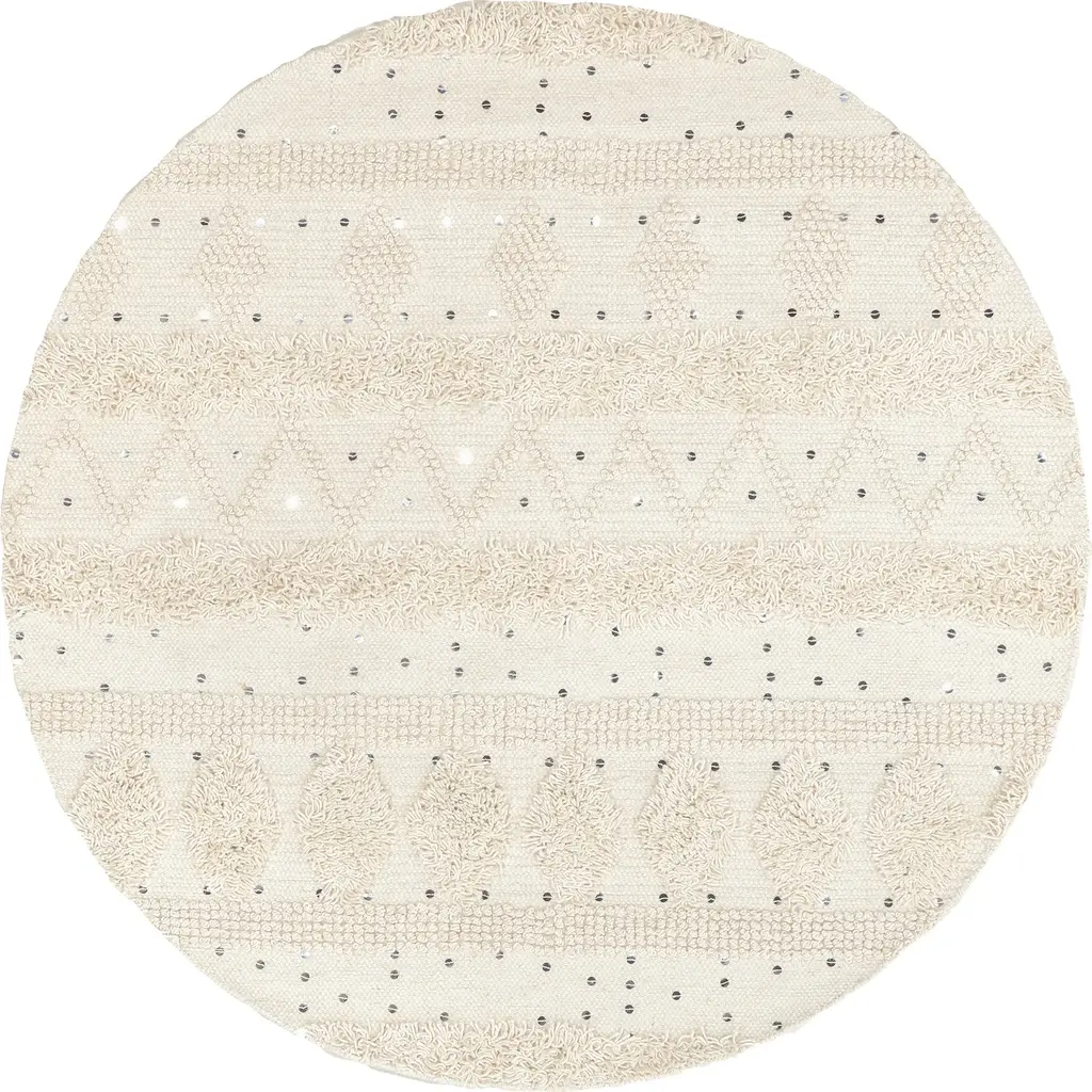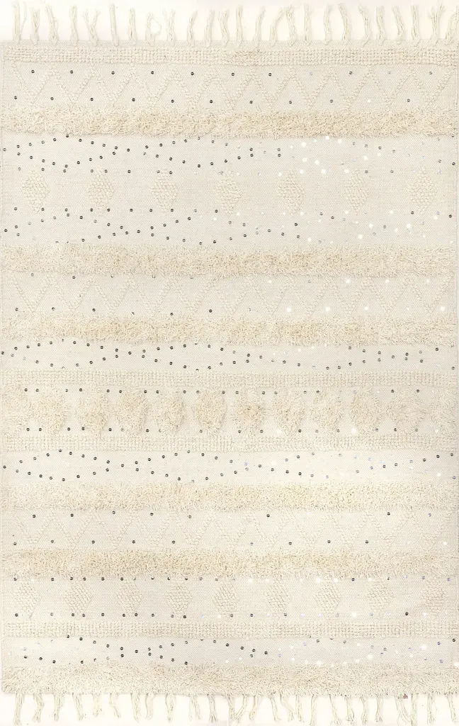 The detail! Featuring a blend of high-low shaggy pile, hand-tufted motifs, and decorative sequins, the Chandy Rug has texture for days. Its eclectic design is sure to add some bohemian flair to your space, while also keeping things low-key thanks to its neutral hue. Made of 100% wool, this rug is super soft underfoot, too, while being unique to your home due to its handmade nature. Create the home you've always dreamed of with our gorgeous area rugs!