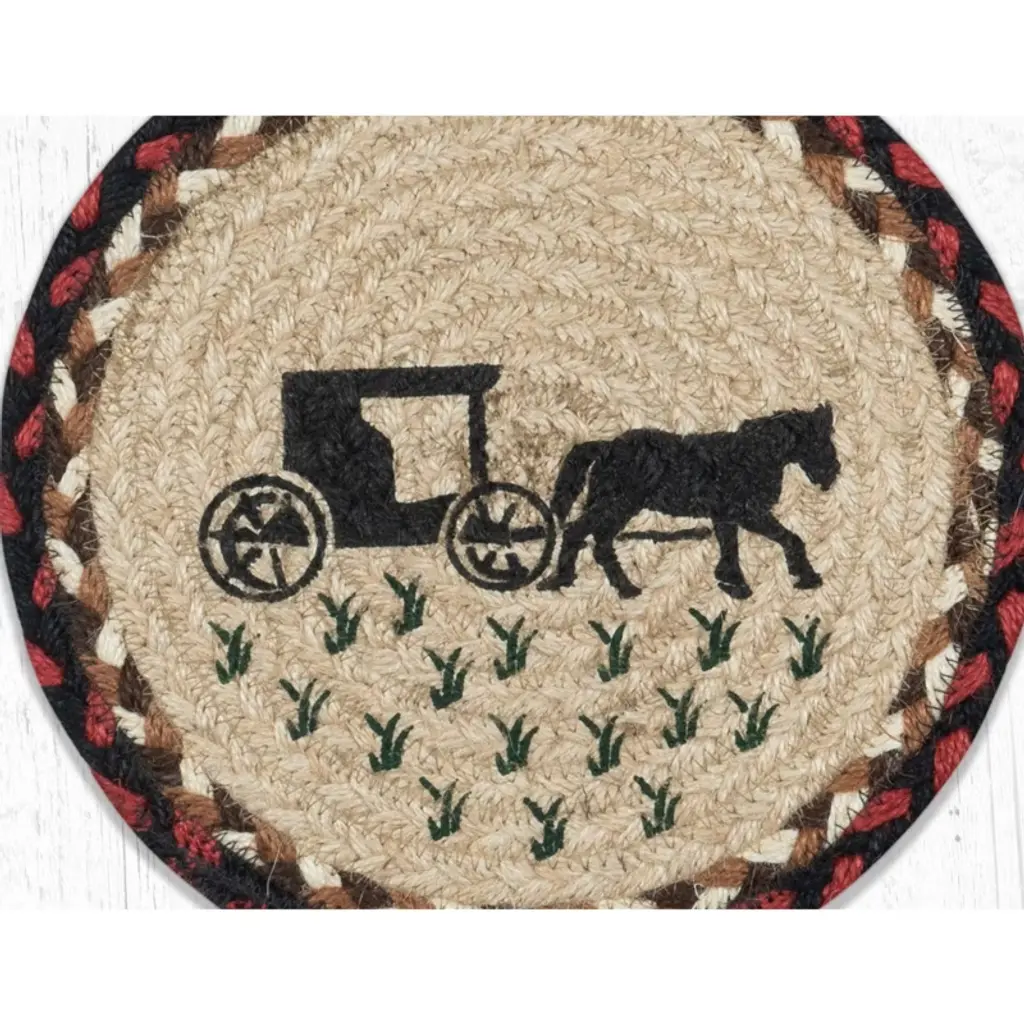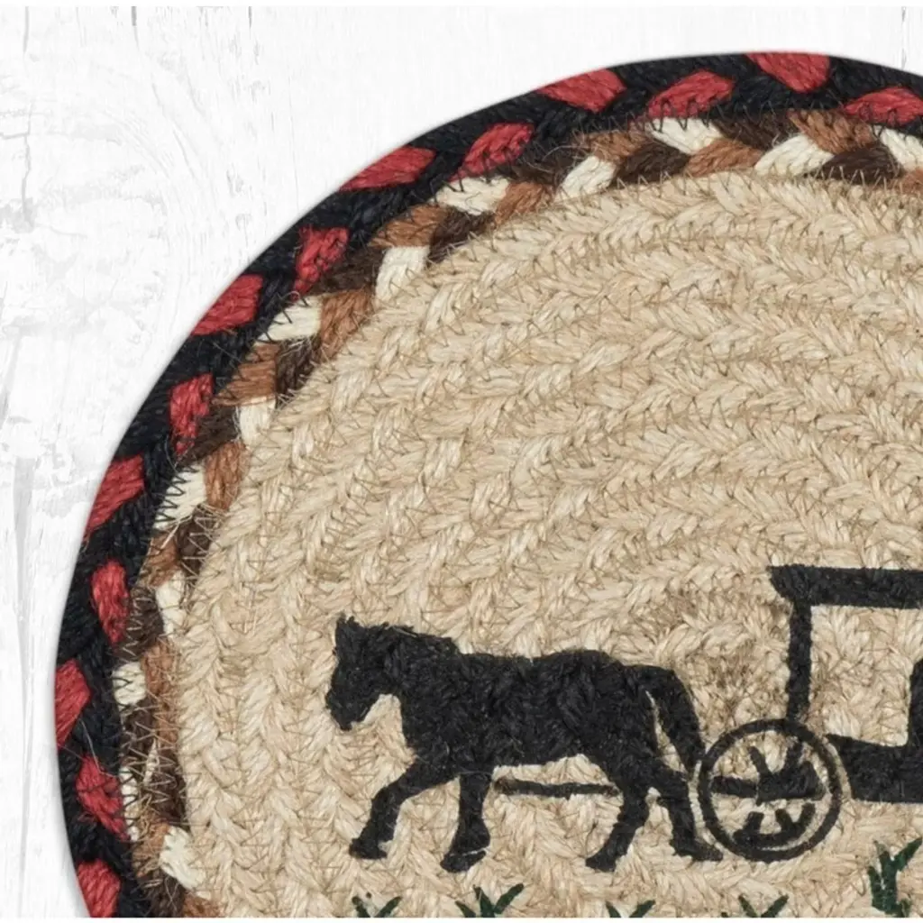 Earth Rugs Amish Buggy Round Trivet 10"x10" – Rustic Braided Jute With Vintage Horse & Carriage Print