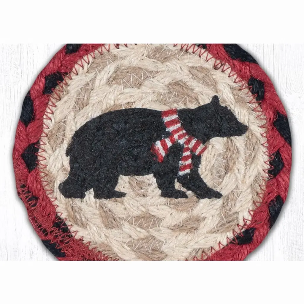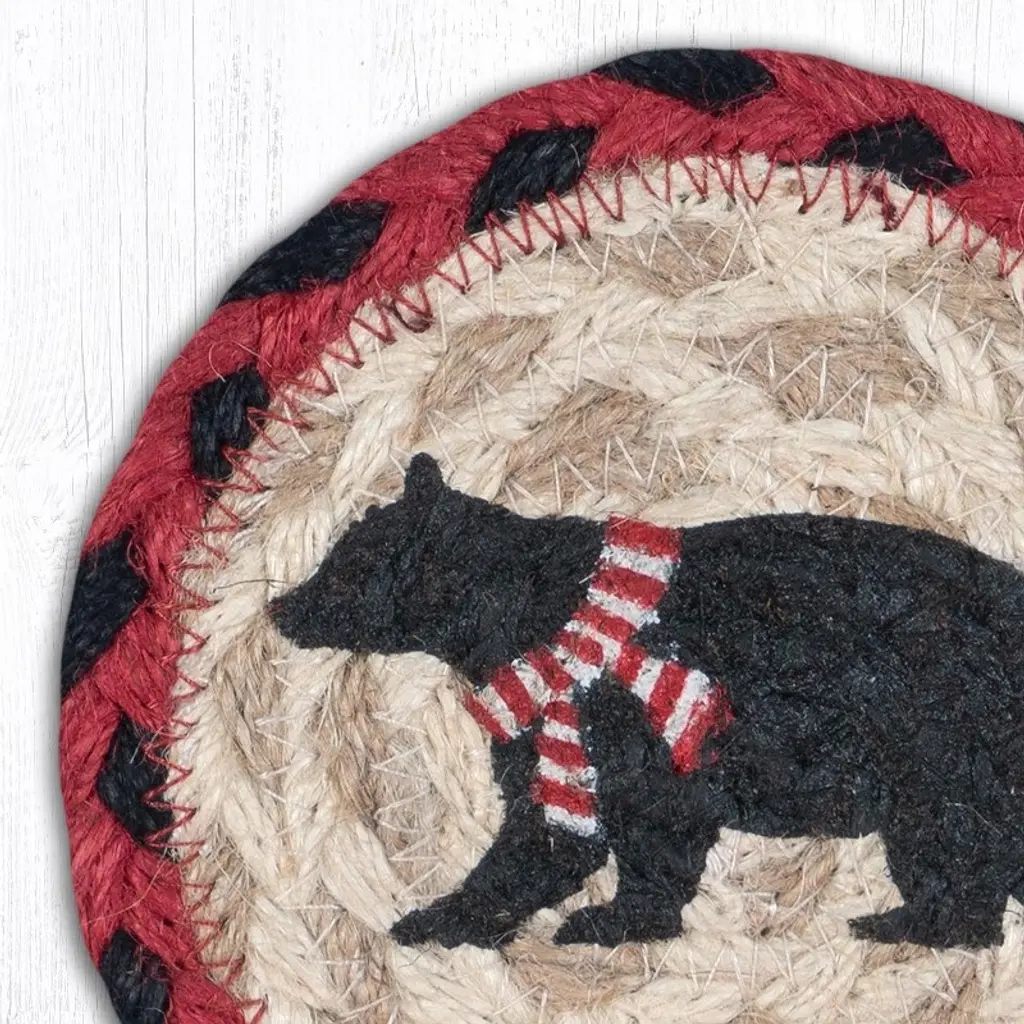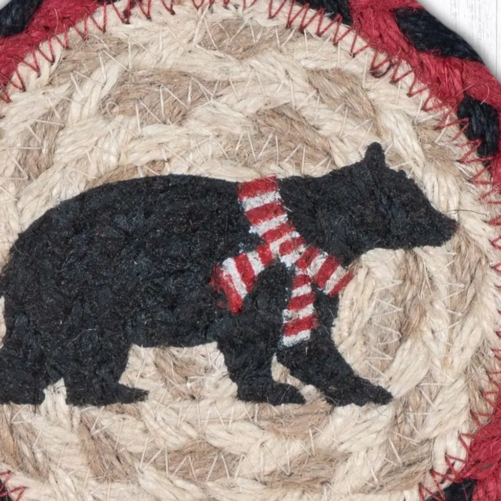 Earth Rugs Bear Printed Coaster – Red Stripe Scarf Design, Braided Jute, Rustic Cabin Style, 5"x5"