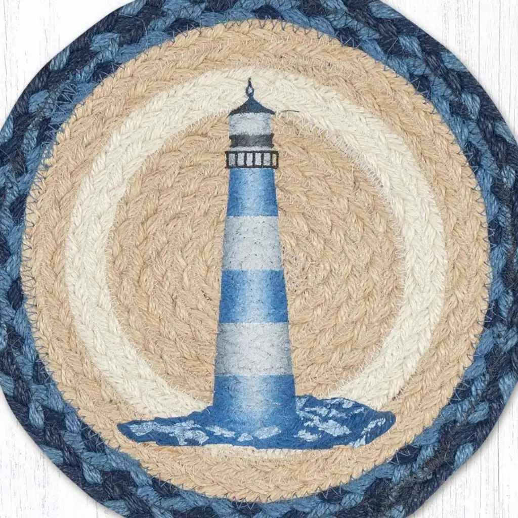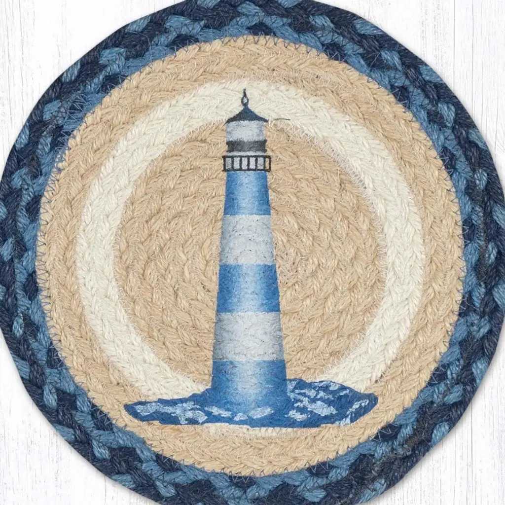 Earth Rugs Blue And White Lighthouse Round Trivet – 10" Nautical Print On Braided Natural Jute