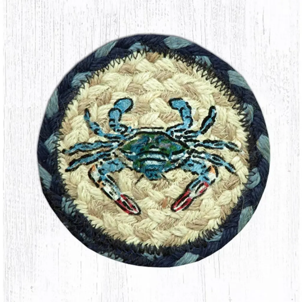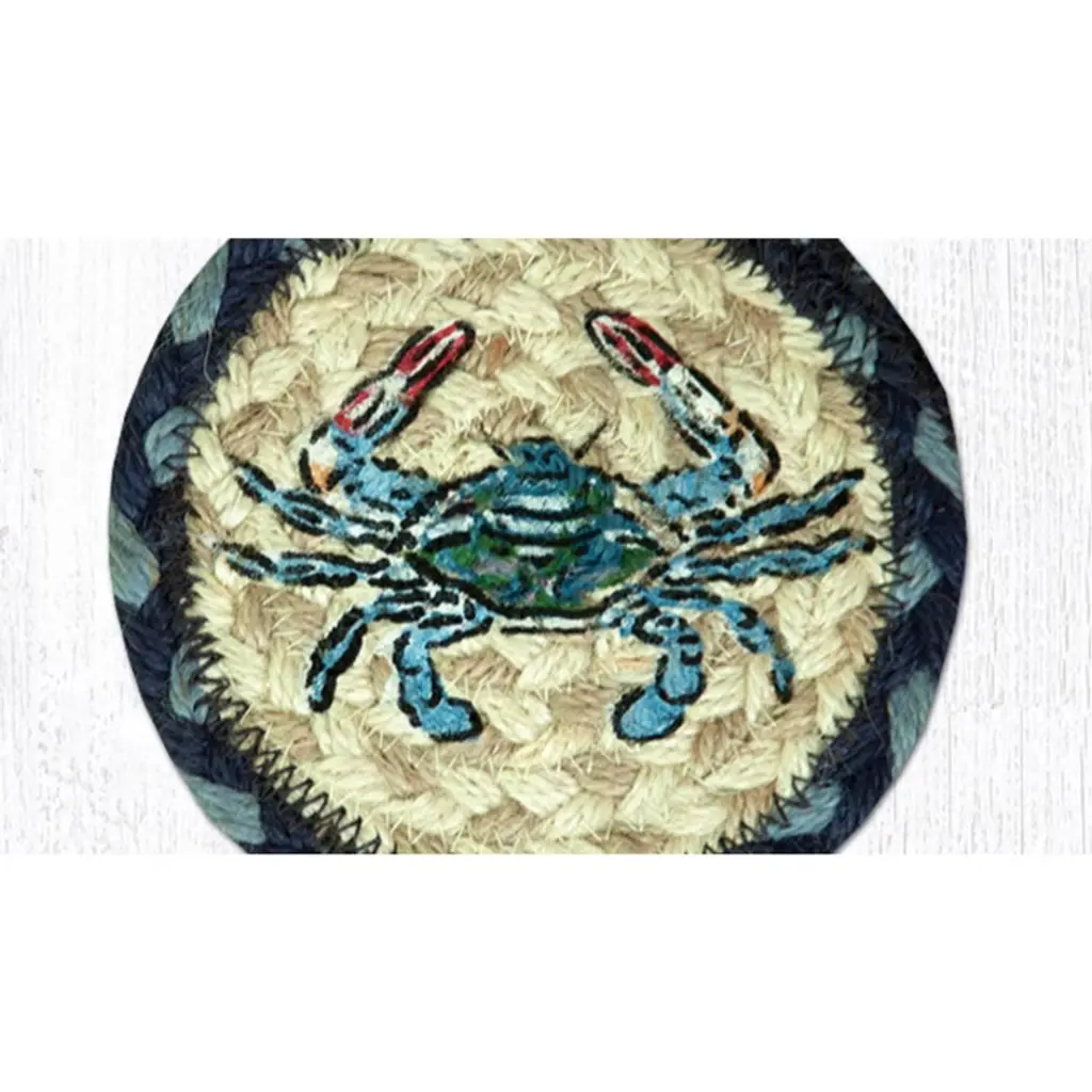 Earth Rugs Blue Crab Coaster – 5"x5" Braided Jute With Coastal Nautical Crab Print For Beach House & Seaside Decor