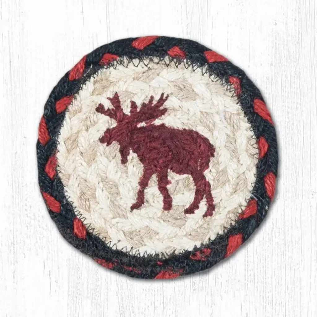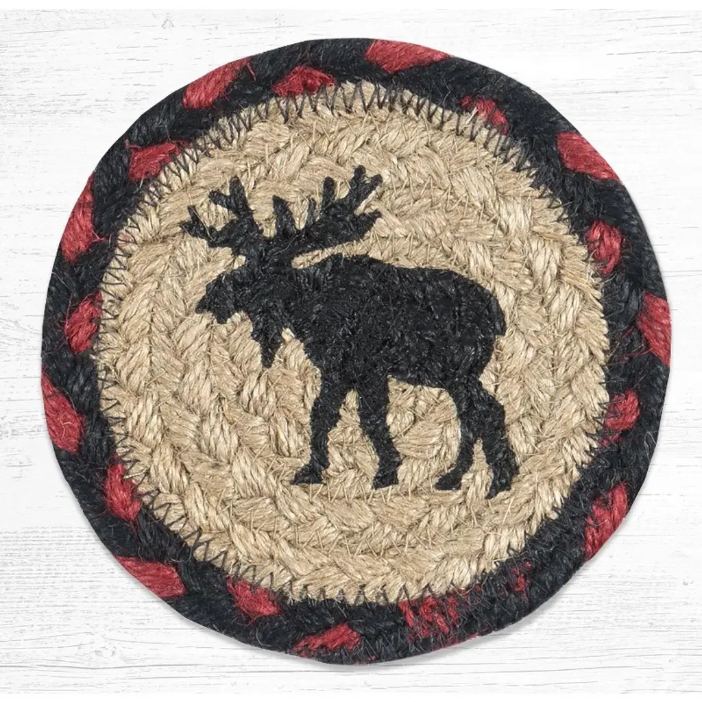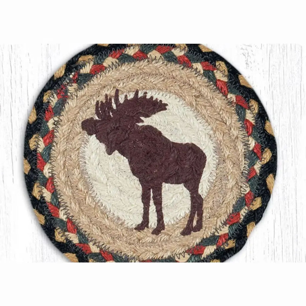 Earth Rugs Bull Moose Round Braided Jute Coaster – 7"x7" Hand-Stenciled Rustic Lodge Accent Bring rustic charm to your home with the Earth Rugs Bull Moose Round Large Coaster. Measuring 7"x7", this handcrafted coaster is made from 100% natural braided jute and features a hand-stenciled moose design that celebrates lodge and woodland style décor. Perfect for mugs, bowls, and pitchers, it combines durability with eco-friendly craftsmanship while adding a unique rustic accent to your space. Key Benefits : Protects tabletops from heat, scratches, and spills.Larger size accommodates more than standard coasters.Adds warmth and character to rustic, lodge, or cabin décor.Lightweight yet strong for everyday use.Versatile piece that can also be used as a small trivet or decorative accent.