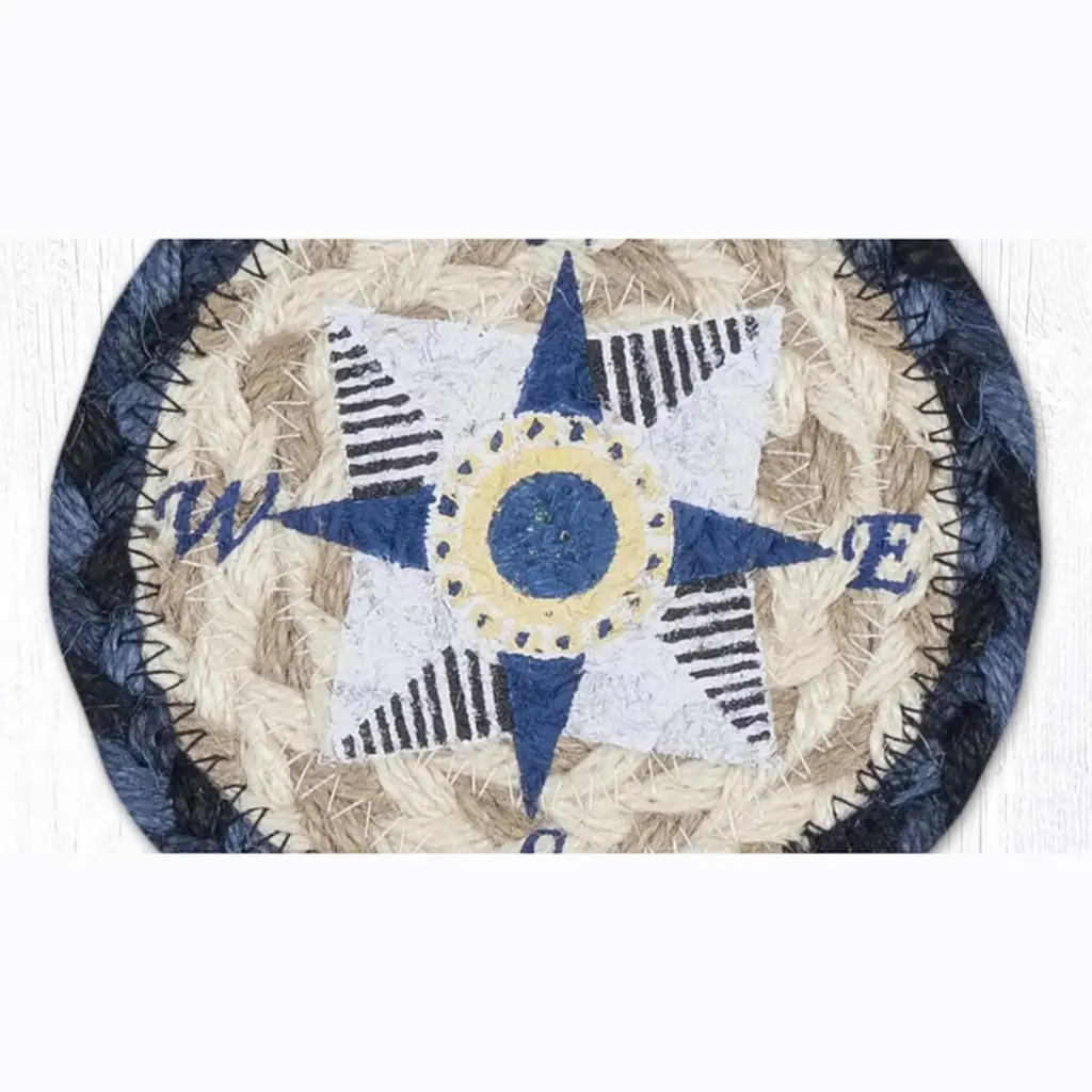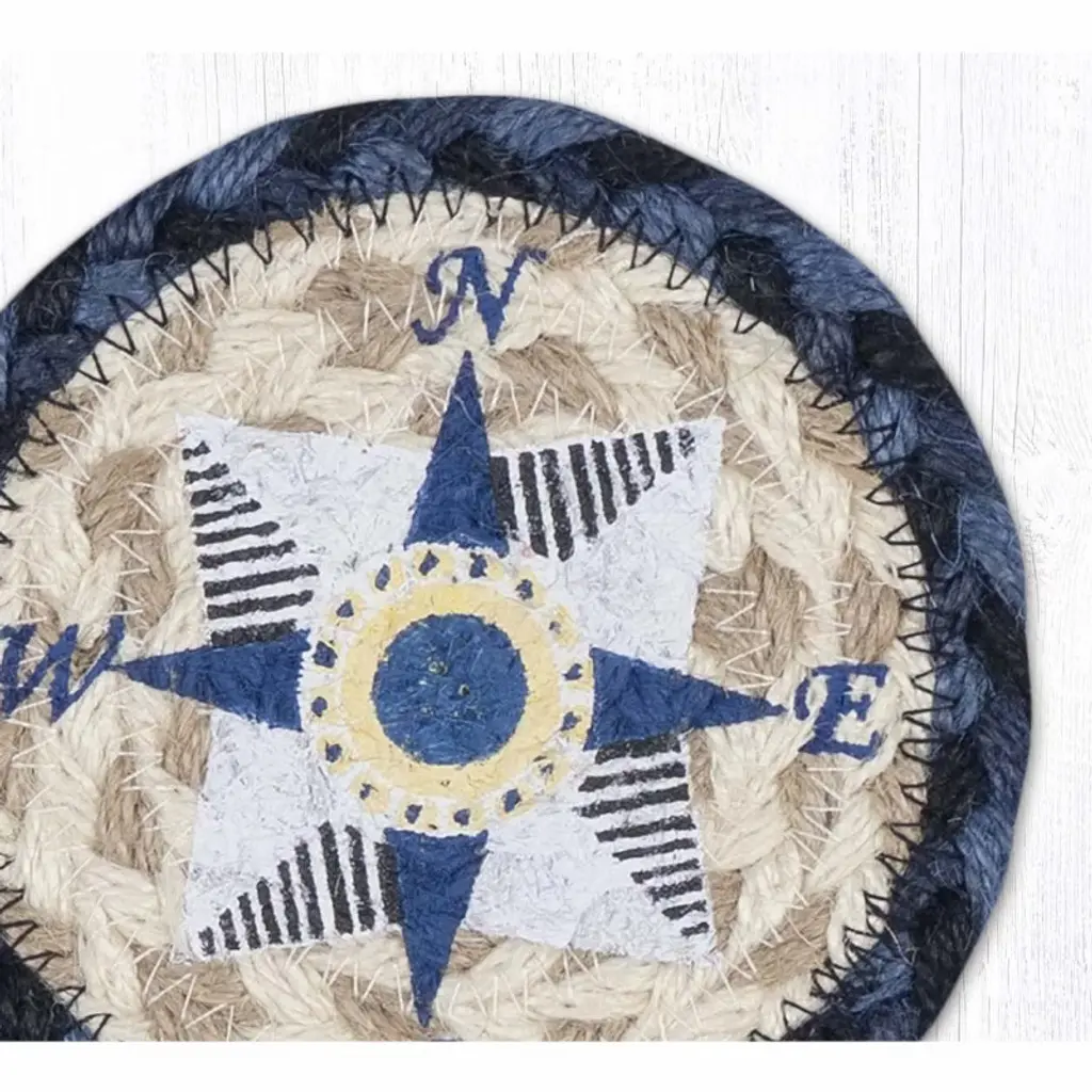 Navigate your space with seaside style using the Earth Rugs Coastal Compass Printed Coaster, a 5"x5" square made from durable braided jute and featuring a classic nautical compass rose design. With navy and ivory tones on a textured jute background, this handcrafted piece blends coastal elegance with everyday functionality. Its rustic weave and maritime motif make it ideal for beach homes, cabins, or nautical-themed spaces. Functional and stylish, it protects surfaces while steering your décor in a chic, ocean-inspired direction. Key Features: Material: Made from 100% natural, eco-friendly braided jute Color: Navy and ivory compass design on an earthy jute background Frame/Edge: Sturdy braided edge enhances structure and coastal flair Dimensions: 5 inches x 5 inches square Style Match: Great fit for nautical, coastal, marine, or vintage sailing decor themes