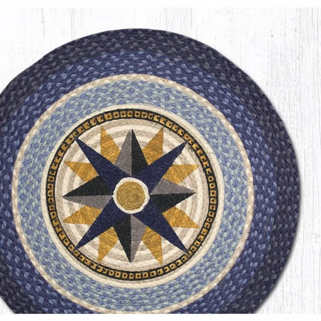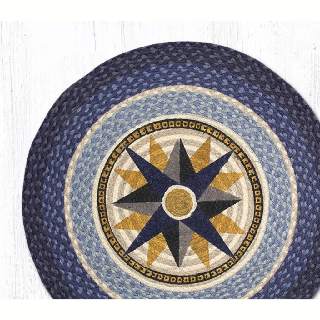 Earth Rugs Compass Round Patch Tread Rug – 27"x27" Wool Blend, Hand-stitched Nautical Design With Earth-tone Braided Border
