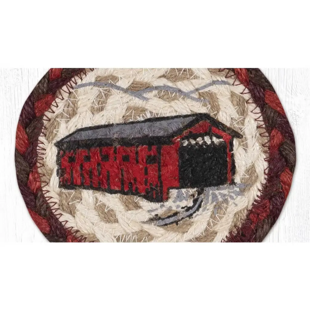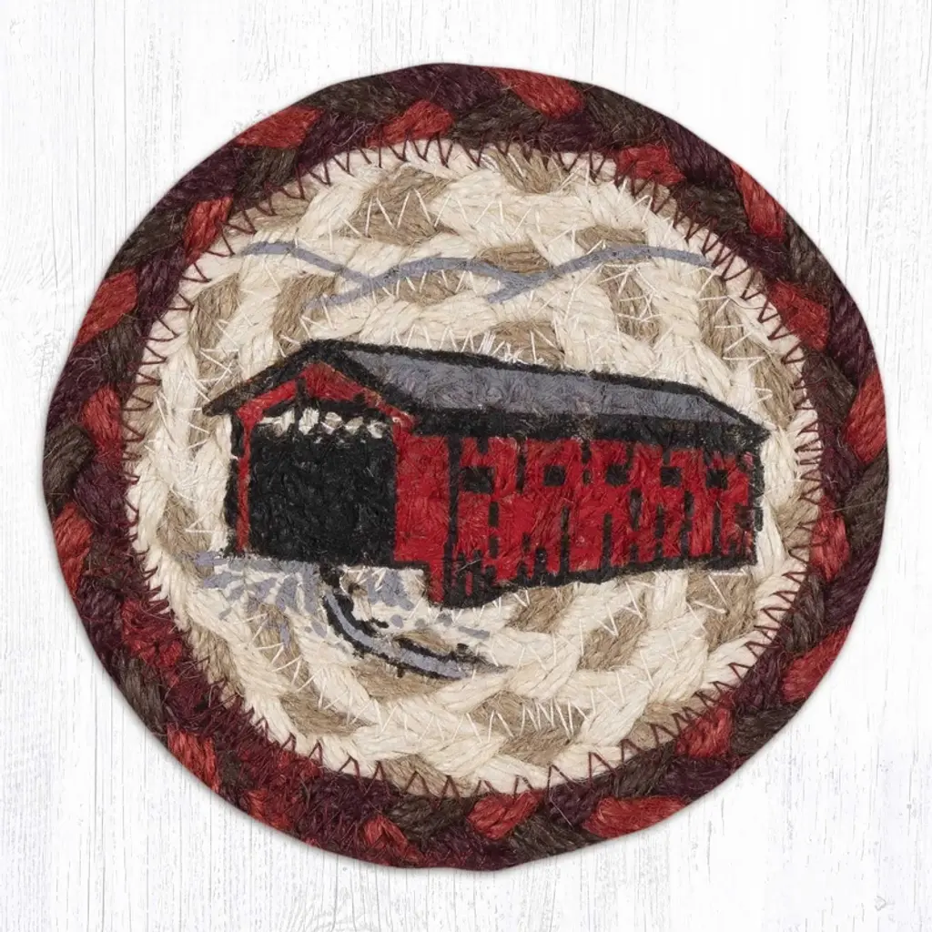 Earth Rugs Covered Bridge Printed Coaster – Rustic Country Scene On Braided Jute, Farmhouse Style, 5"x5"