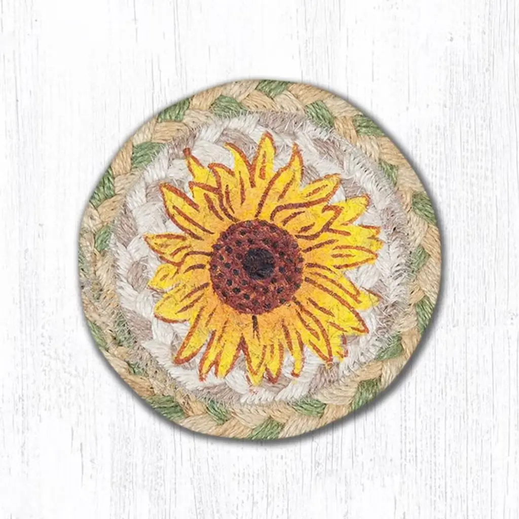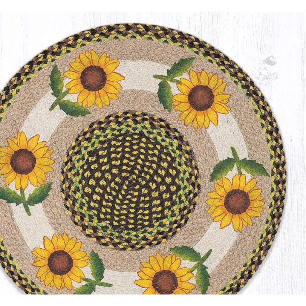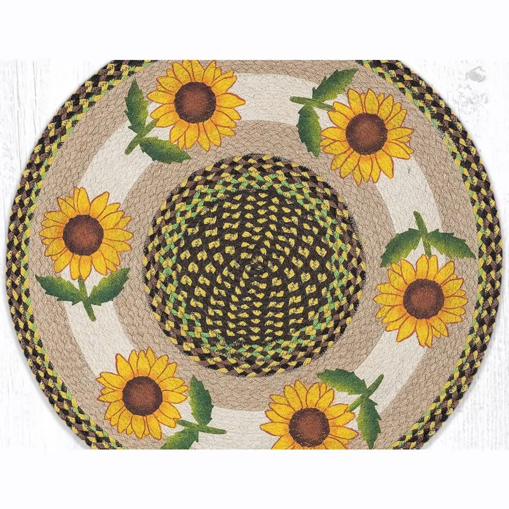 Brighten your home with the warmth of the Earth Rugs Good Sunflower Round Patch Tread, a 27"x27" hand-stenciled braided rug that brings the charm of blooming sunflowers indoors. Crafted from 100% natural jute, this eco-friendly round tread features a rustic sunflower centerpiece surrounded by a multi-toned braided border. The sunflower's vibrant yellows and earthy greens add a cheerful farmhouse feel to kitchens, breakfast nooks, or sunrooms. Its compact round shape is ideal for creating cozy focal points in any rustic or floral-inspired space. Key Features: Material: 100% eco-friendly braided jute Color Theme: Sunflower yellow, green, natural tan, and rustic brown Design Frame: Round patch center with detailed hand-stenciled sunflower motif Dimensions: 27 inches (Diameter) Style Compatibility: Fits farmhouse, country, rustic floral, and cottage-style decor