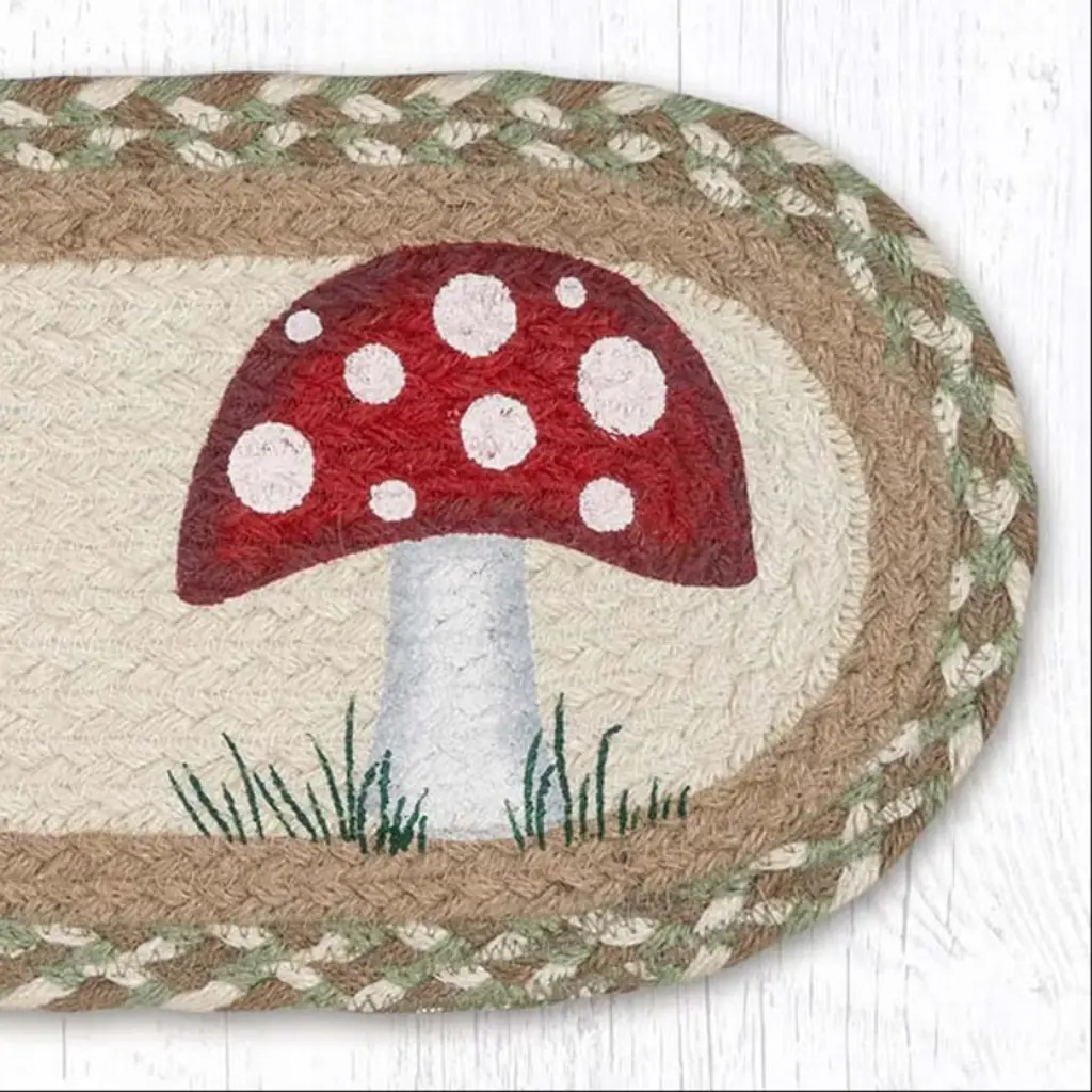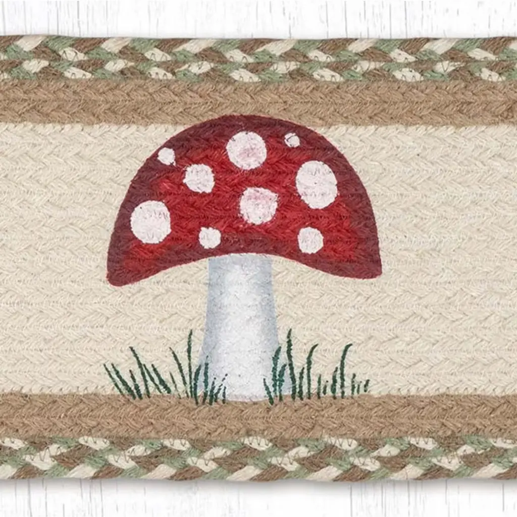 Bring whimsical woodland charm to your home with the Suzanne Pienta Mushroom Stair Tread, hand-stenciled on durable, eco-friendly braided jute. Measuring 27 inches long by 8.25 inches wide, this oval stair rug features a delightful toadstool and mushroom design in earthy reds, browns, and greens—perfect for cottagecore, nature-inspired, or rustic spaces. The natural jute base adds organic texture while offering reliable grip and softness underfoot. Whether displayed on stairs, entryways, or used as a seasonal shelf or table accent, this handcrafted piece adds character and warmth to any corner of your home. Woodland-Inspired Design – Features charming hand-stenciled mushrooms and toadstools for storybook appealFunctional Fit – 27" × 8.25" × 0.25" size works beautifully on stairs, ledges, or narrow surfacesArtisan Original – Artwork by Suzanne Pienta brings whimsy and hand-painted charm to every pieceEco-Conscious Crafting – Made from biodegradable jute, offering natural warmth and textureMulti-Use Flexibility – Use as stair protection or display as seasonal wall or shelf décorHand-Stenciled Uniqueness – Subtle variations in every piece ensure no two are exactly alike