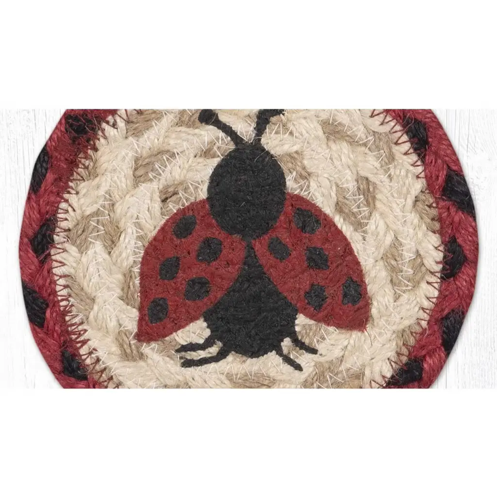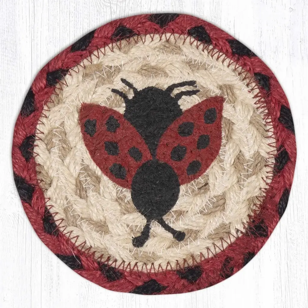 Earth Rugs Ladybug Printed Coaster – Braided Jute, Nature-inspired Accent, 5"x5", Farmhouse Style