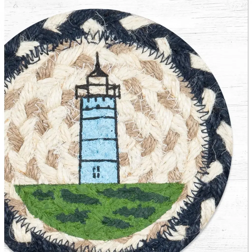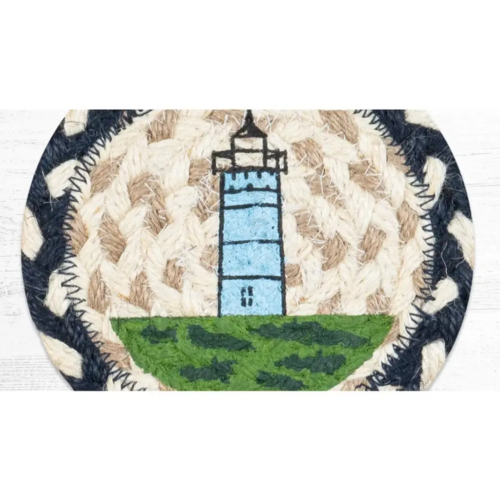 Earth Rugs Nubble Lighthouse Coaster – 5"x5" Braided Jute With Nautical Lighthouse Print For Coastal