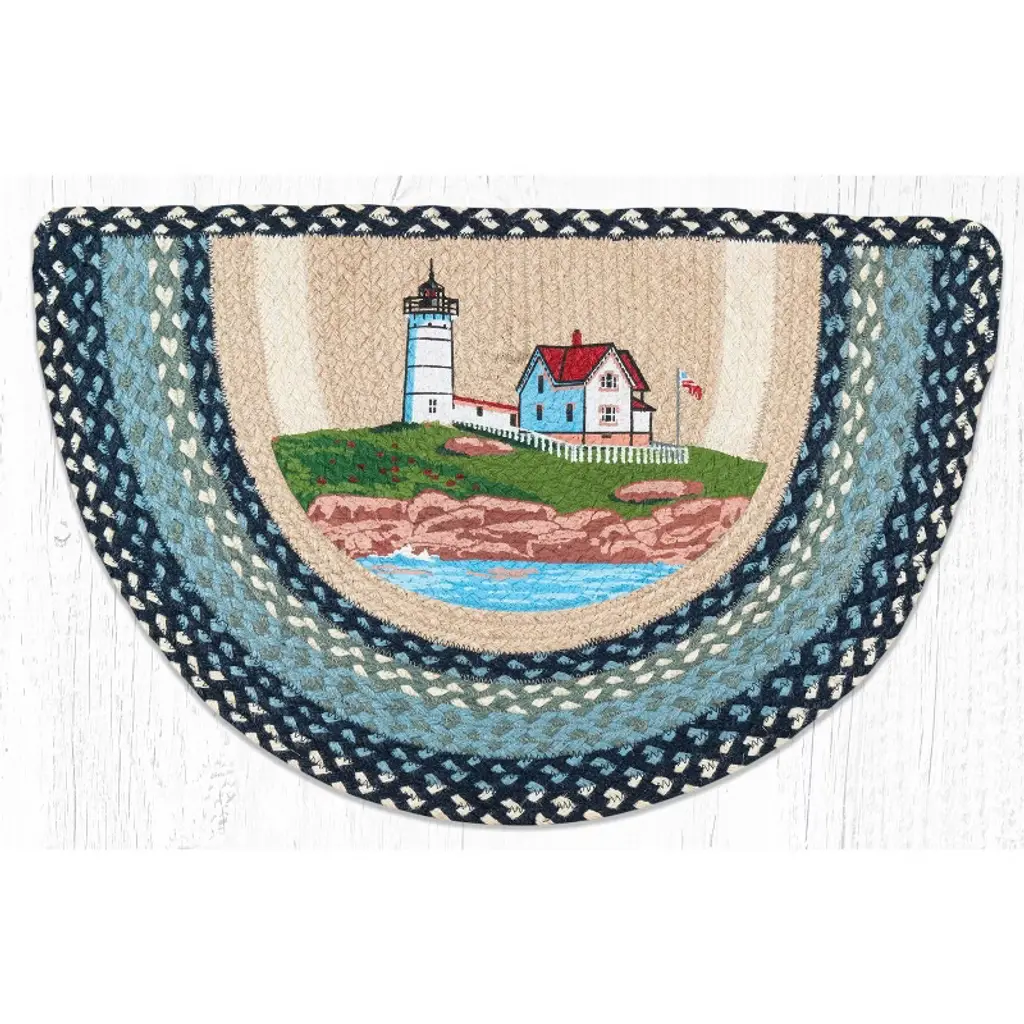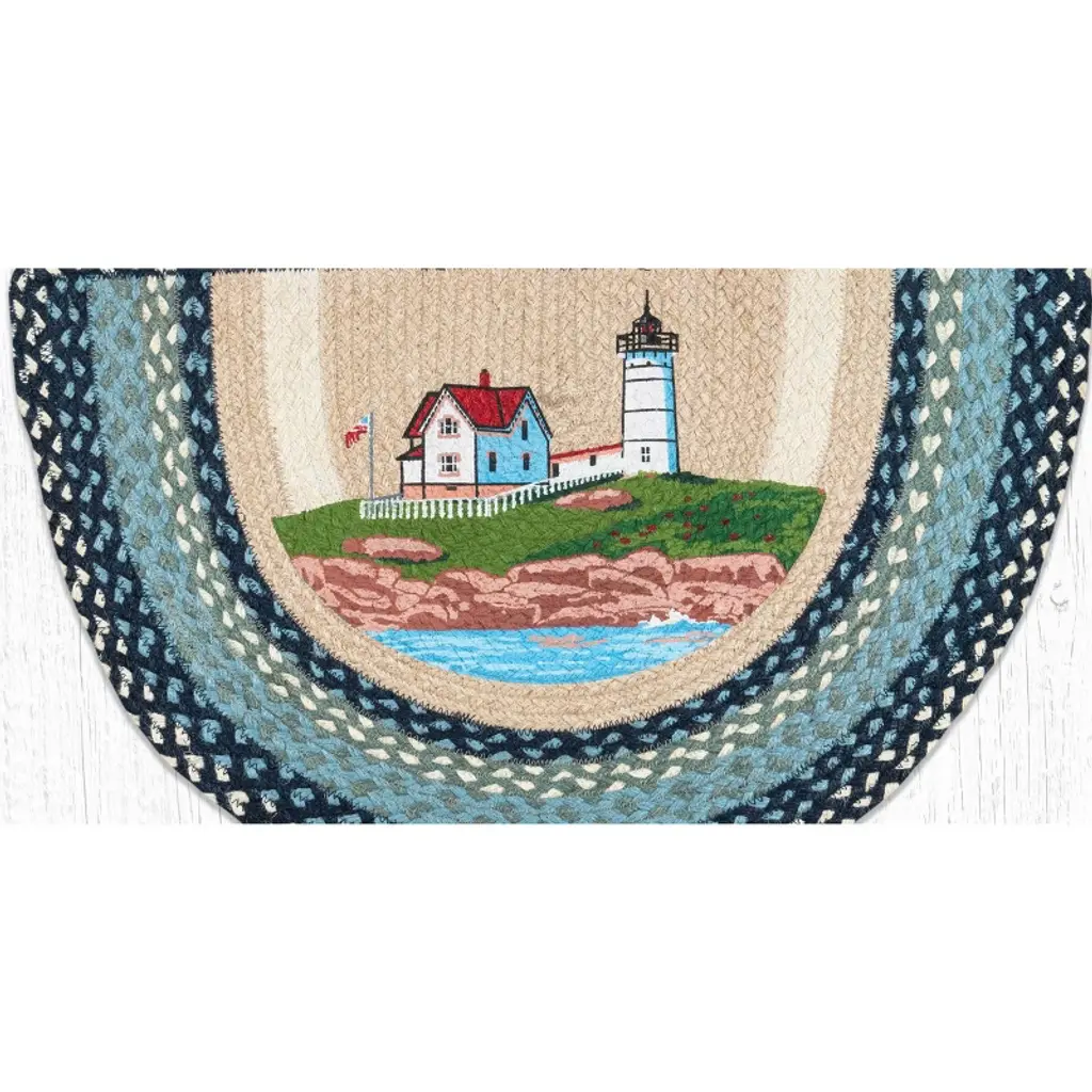 Bring the charm of coastal living into your home with the Earth Rugs Nubble Lighthouse Printed Slice Tread Rug. Measuring 18" high by 29" wide, this semi-circular jute accent mat features a hand-stenciled depiction of the iconic Nubble Lighthouse, making it a standout piece for entryways, kitchens, or mudrooms. Its rustic jute texture adds warmth and durability, while the nautical theme invites a breezy, oceanfront ambiance into any space. This tread rug lies flat and can be placed flush against a wall or door for functional and decorative appeal. A true fusion of style, story, and practicality. Key Features: Material: 100% natural braided jute for eco-friendly durability Color Theme: Earth tones with vibrant coastal red, blue, and white accents Design: Hand-stenciled lighthouse print inspired by the Nubble Lighthouse in Maine Frame/Shape: Slice-shaped design fits flush against flat surfaces like doors and walls Dimensions: 18" H × 29" W Style Compatibility: Complements coastal, rustic, farmhouse, and nautical decor