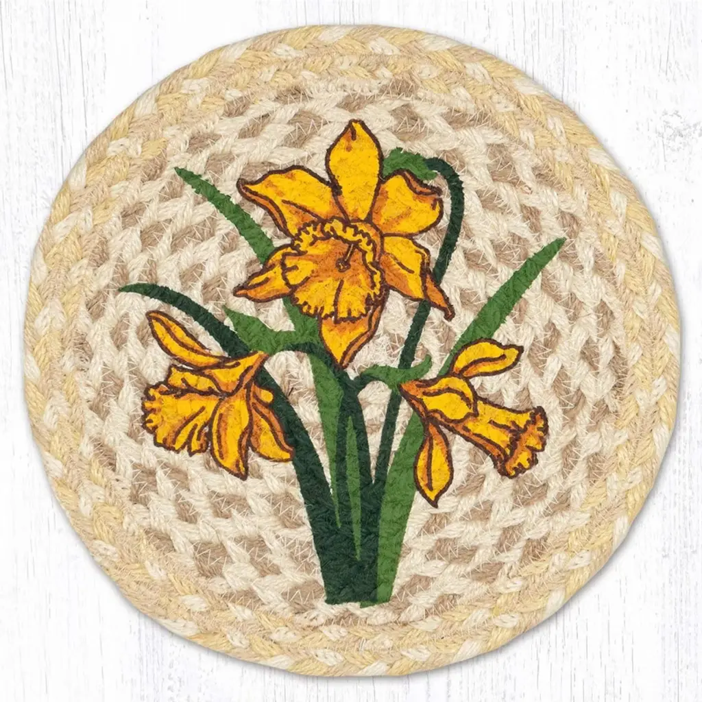 Celebrate spring in full bloom with the Earth Rugs Orange Tulip Printed Jute Coaster. This 5-inch round coaster brings a burst of floral freshness to any room with its hand-printed tulip design in cheerful orange tones. Crafted from sustainably sourced braided jute, it offers both rustic texture and reliable surface protection—perfect for brightening up farmhouse tables, kitchen counters, or garden-party setups. Key Features: Material: 100% natural hand-braided jute Design: Printed orange tulip with green stem and soft neutral background Dimensions: 5" Diameter Backing: Reversible; stitched edges for durability Style Match: Ideal for spring, farmhouse, floral, or botanical decor Shape: Round coaster with textured braided weave