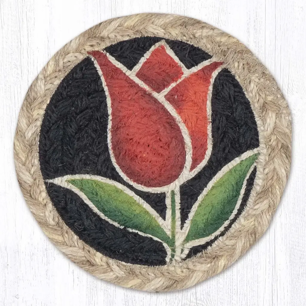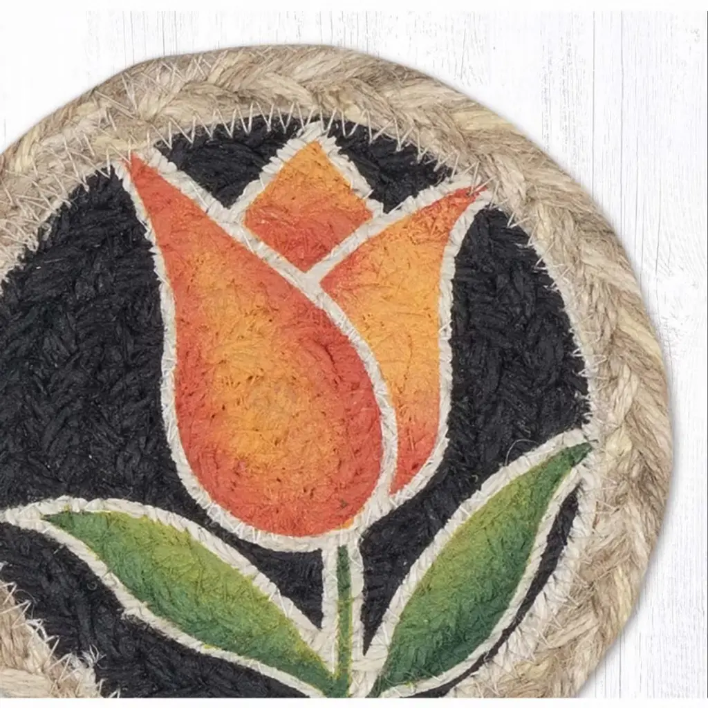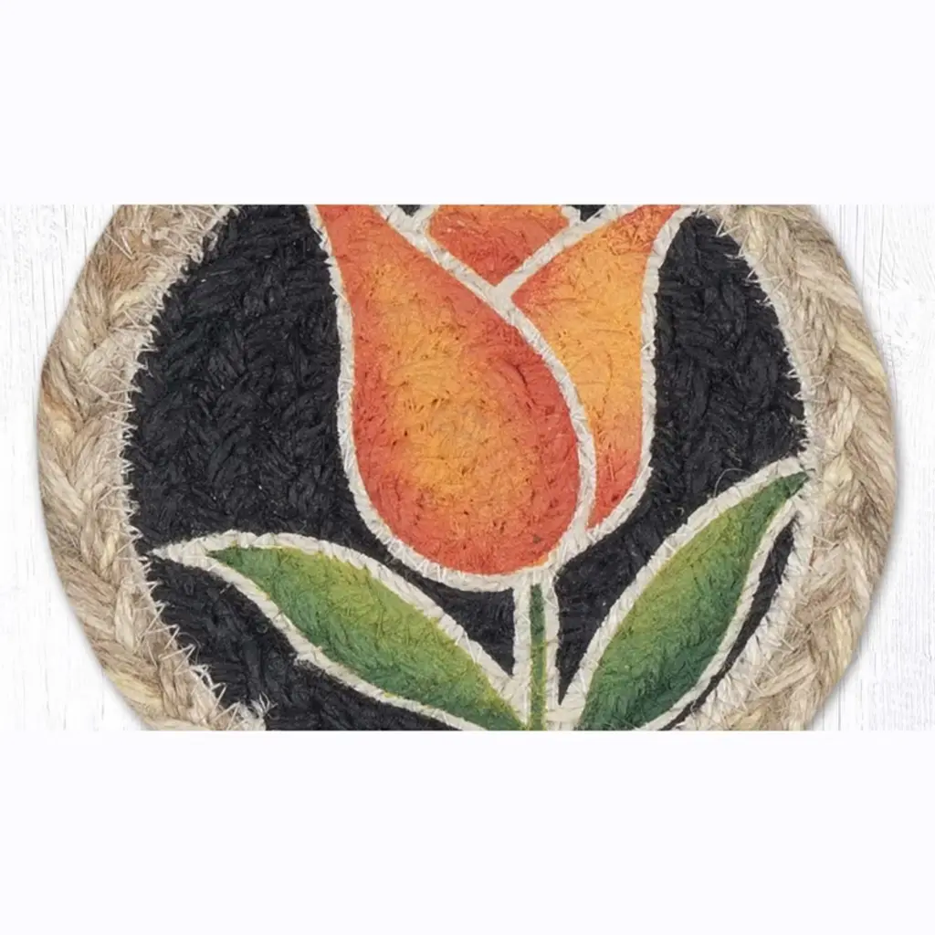Earth Rugs Orange Tulip Jute Coaster – 5"x5" Round Natural Braided Floral Coaster With Spring Bloom Print
