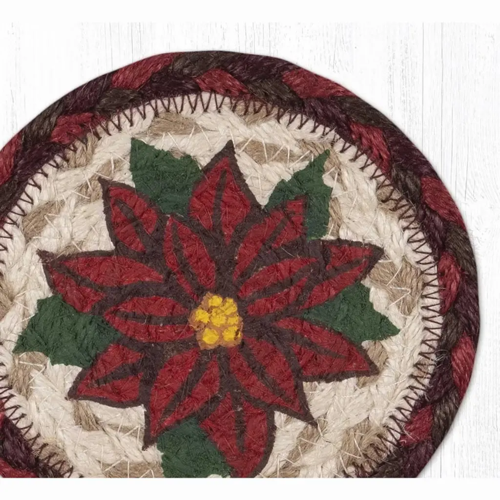Earth Rugs Poinsettia Printed Coaster – 5"x5" Square Braided Jute, Rustic Christmas Floral Accent