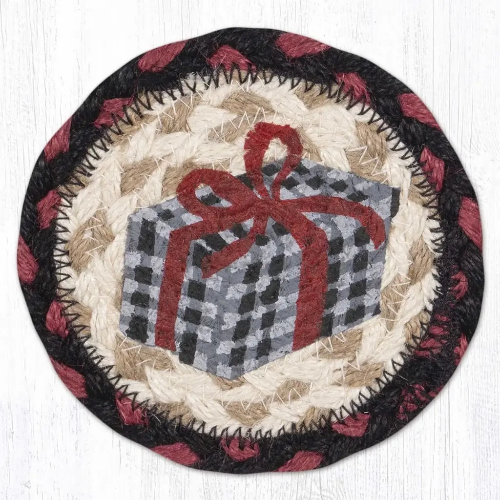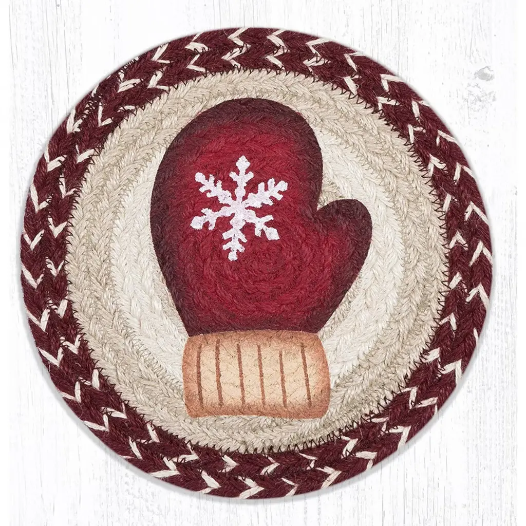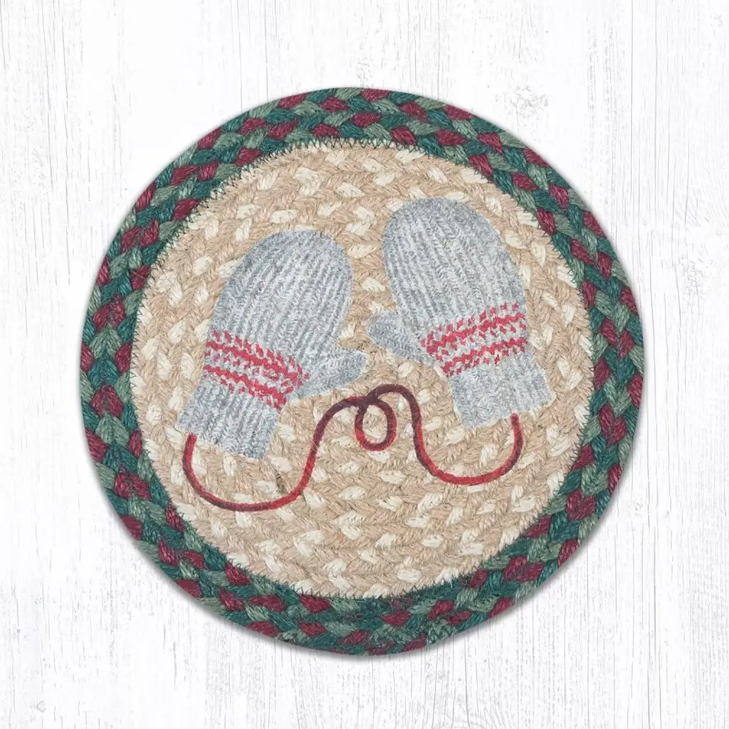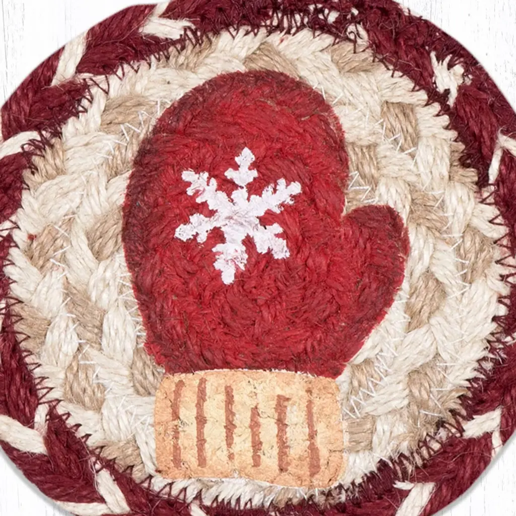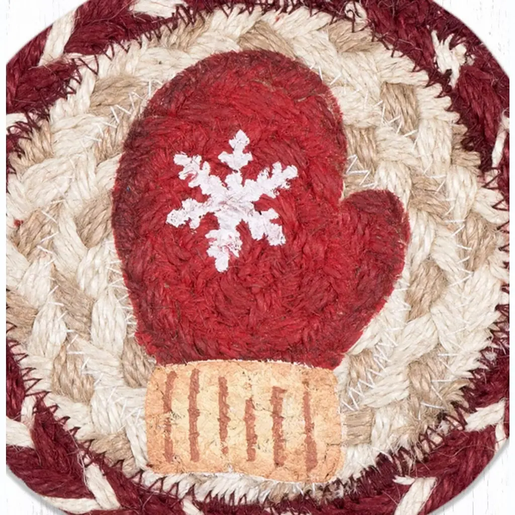 Earth Rugs Red Mitten Printed Jute Coaster 5"x5" Round Rustic Holiday Accent Bring festive warmth to your home with the Earth Rugs Red Mitten Printed Round Jute Coaster. Designed with a hand-stenciled red mitten motif by artist Suzanne Pienta, this rustic coaster adds both style and function to your table setting. Made from 100% natural jute and hand-braided by skilled artisans in Bangladesh, this coaster is eco-friendly, durable, and designed to last. Its 5" round size makes it perfect for protecting your tabletops from heat, scratches, and drink stains while adding a touch of holiday spirit. Key Features : Surface Protection: Shields tables from heat, scratches, and spills. Festive Touch: Adds holiday warmth with a red mitten print. Eco-Friendly Choice: Made from 100% natural jute. Lightweight & Handy: Easy to move, store, and use daily. Gift-Ready: Makes a thoughtful seasonal or housewarming gift.
