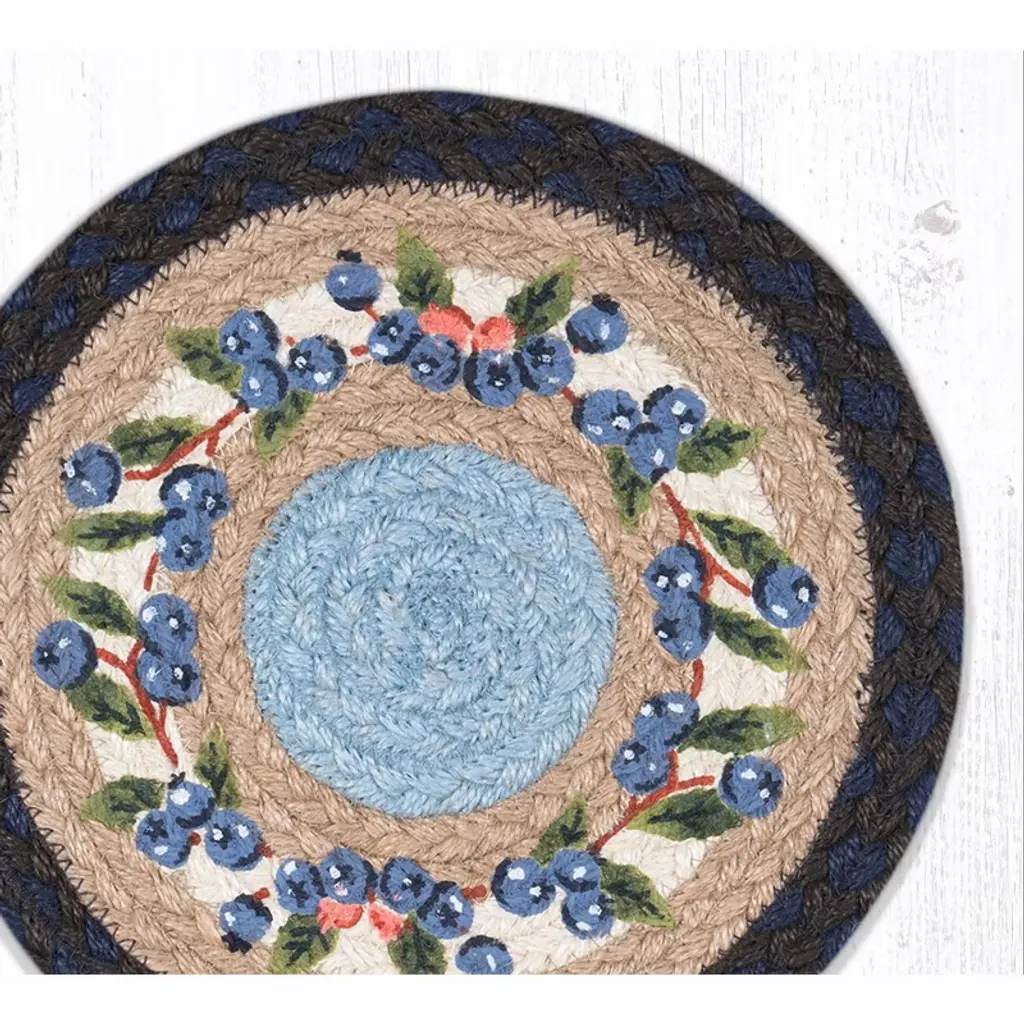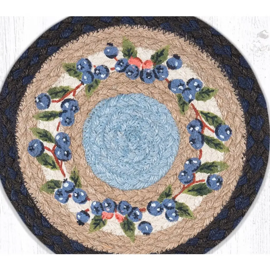 Earth Rugs Round Jute Trivet 10"x10" – Blueberry Vine Print With Braided Natural Design