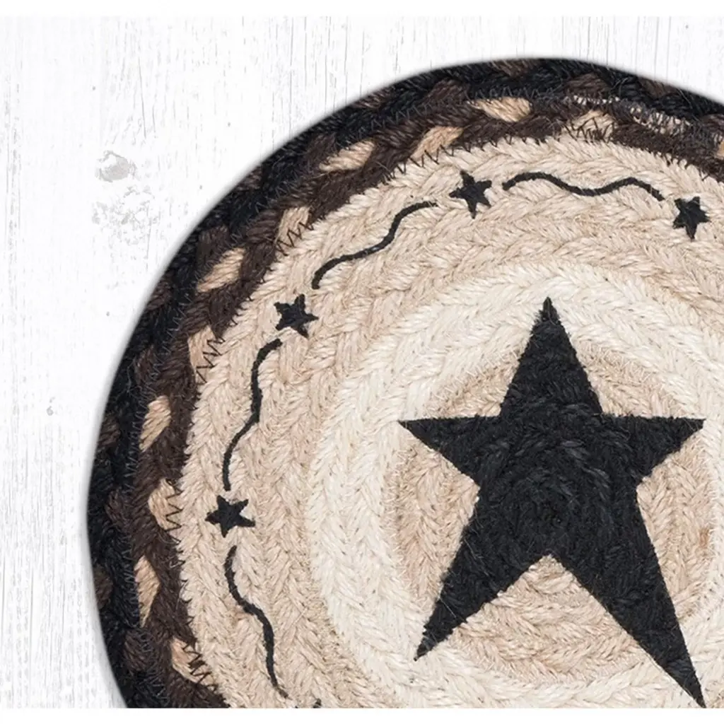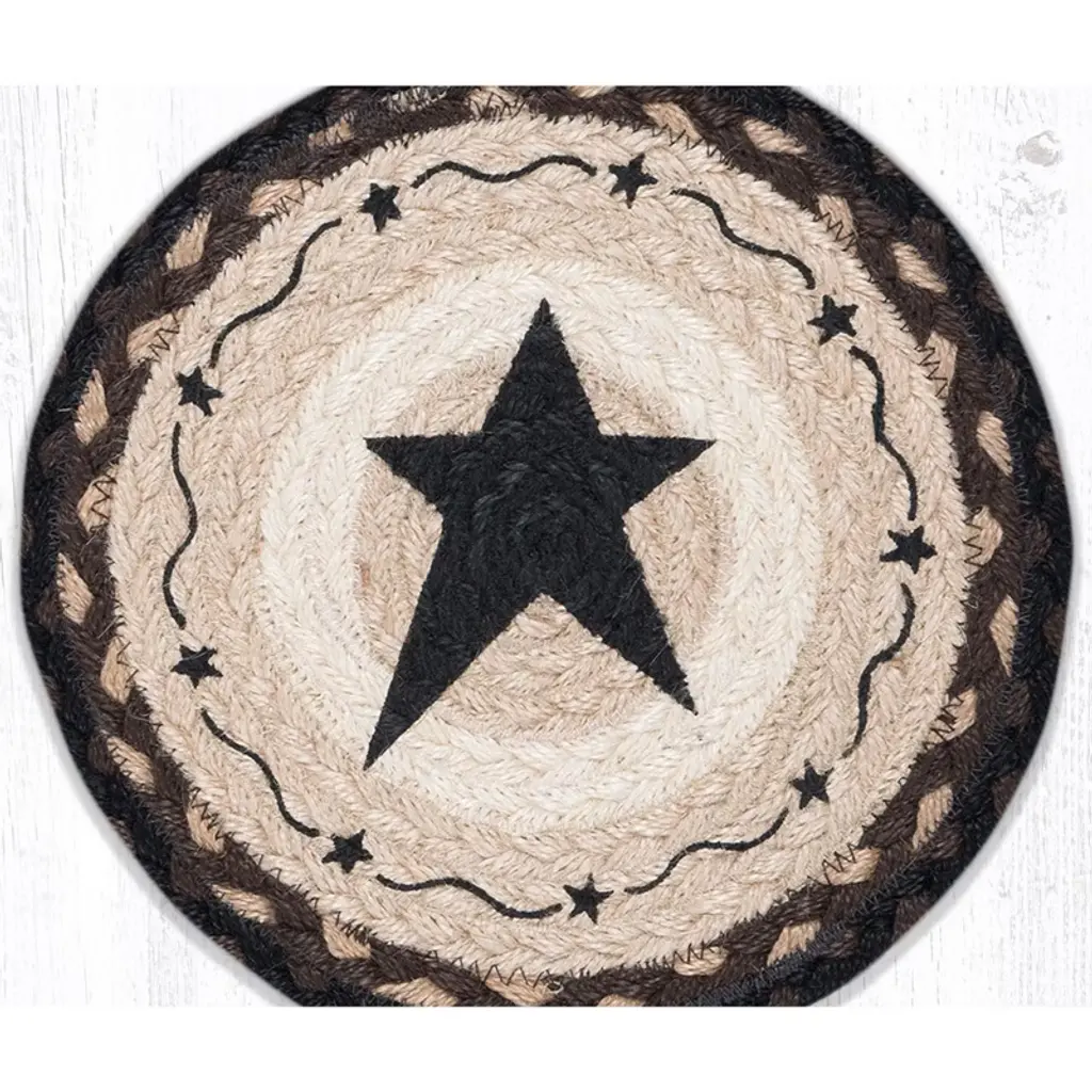 Earth Rugs Round Jute Trivet 10"x10" – Primitive Black Star Design On Natural Braided Fiber