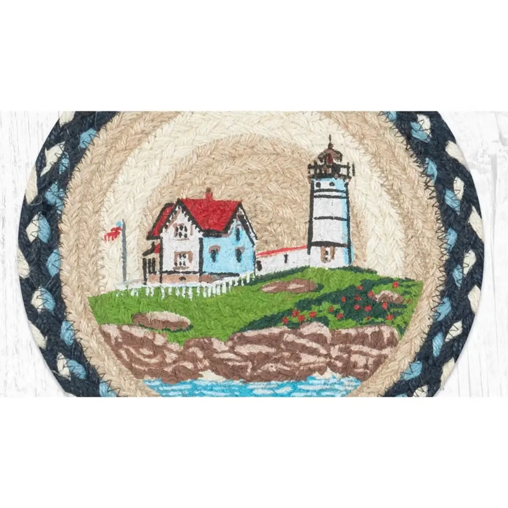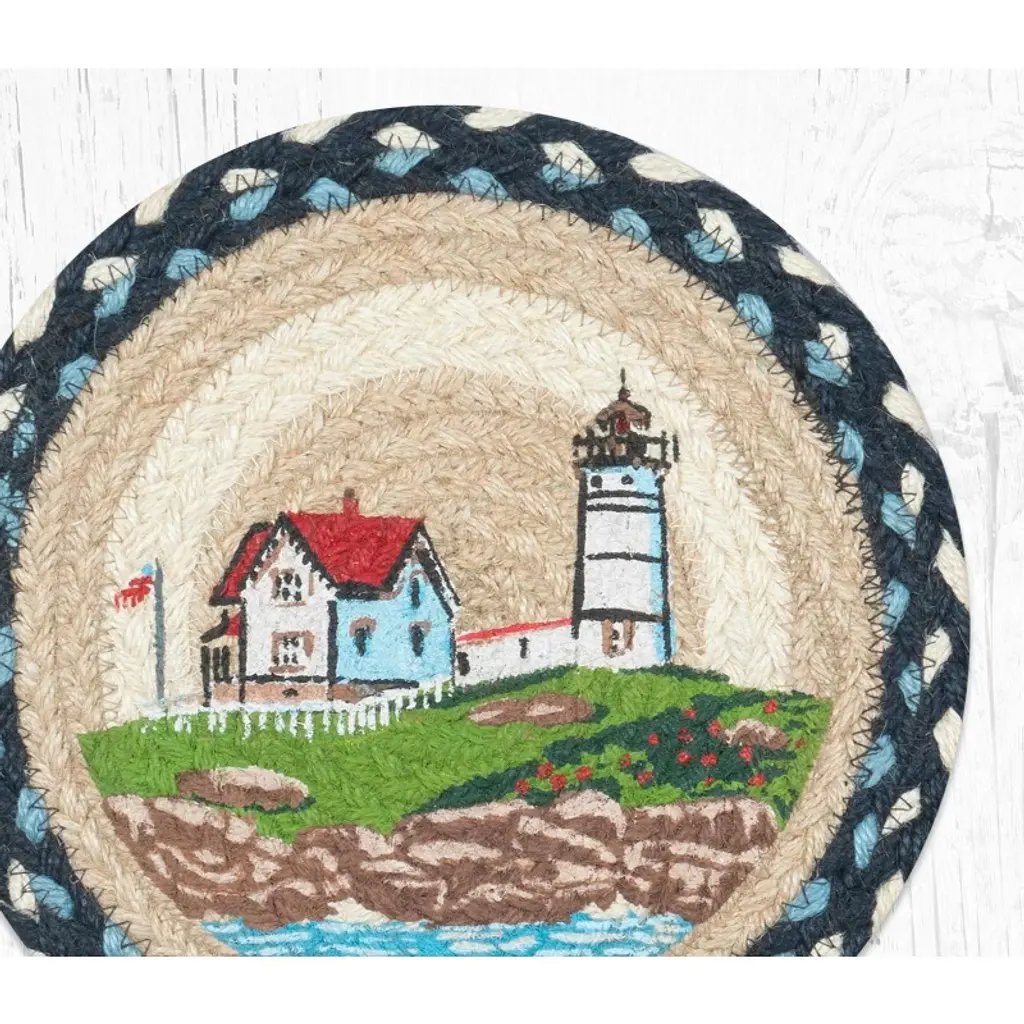 Bring a breath of coastal serenity into your home with the Earth Rugs Nubble Lighthouse Printed Round Trivet. Measuring 10 inches in diameter, this beautifully braided jute trivet features a hand-stenciled illustration of the iconic Nubble Lighthouse overlooking the sea, rendered in calming tones of blue, red, and cream. Made from 100% natural jute, it offers durability, heat protection, and nautical charm all in one. Whether placed under a teapot, hot dish, or used as a coastal accent, this piece adds warmth and a seaside spirit to any space. Key Features: Material: 100% natural braided jute Color Theme: Coastal tones of blue, white, red, and beige Frame: Stitched edge ensures lasting form and structure Dimensions: 10" Diameter Style Compatibility: Perfect for nautical, beach house, coastal cottage, or seaside-inspired decor