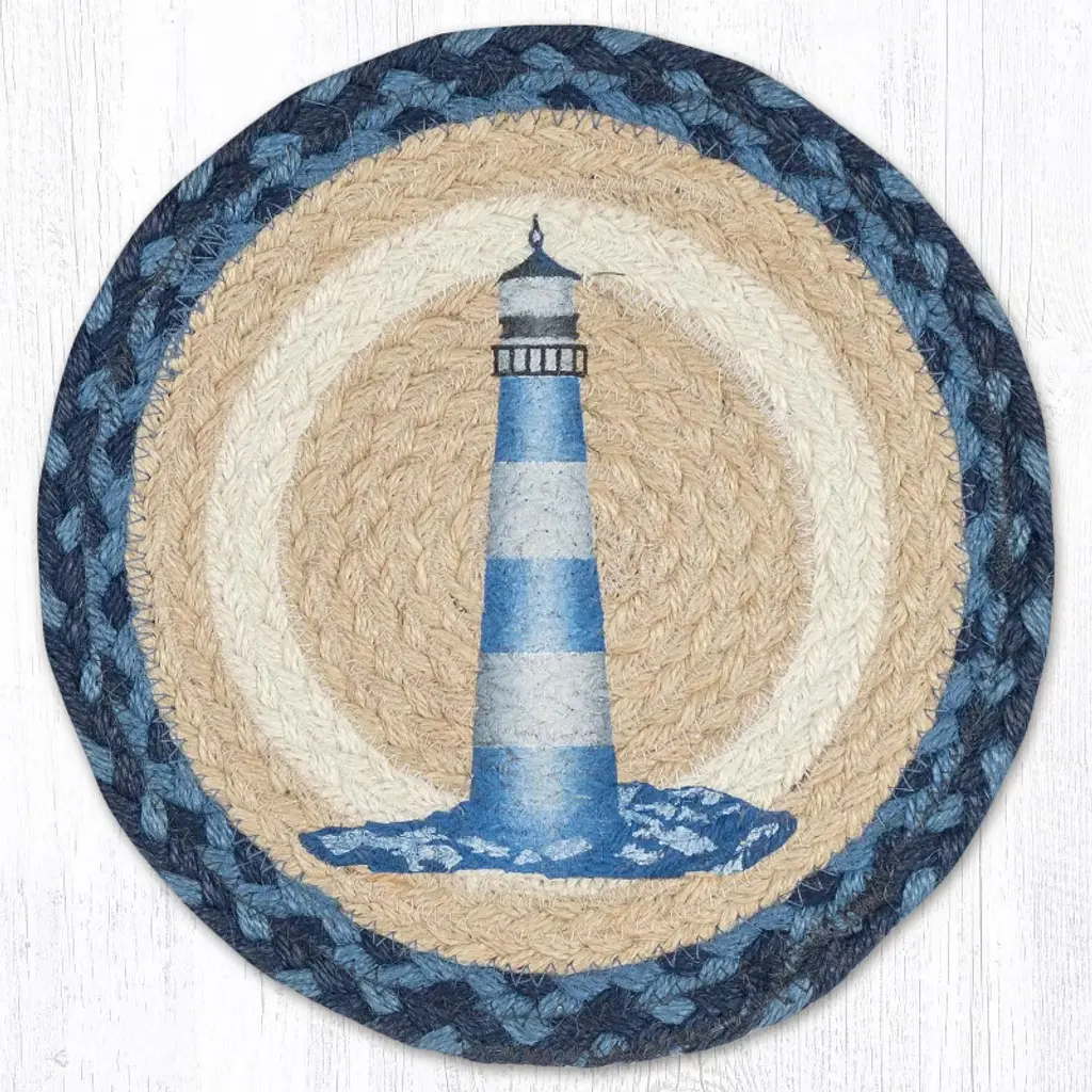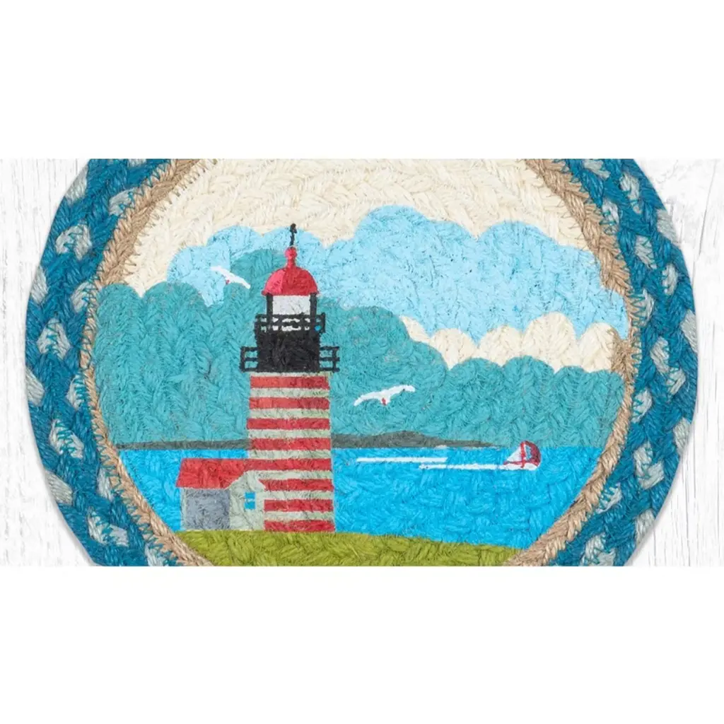 Earth Rugs Round Trivet – 10"x10" Quoddy Lighthouse Printed Braided Jute Mat In Nautical Coastal New England Style