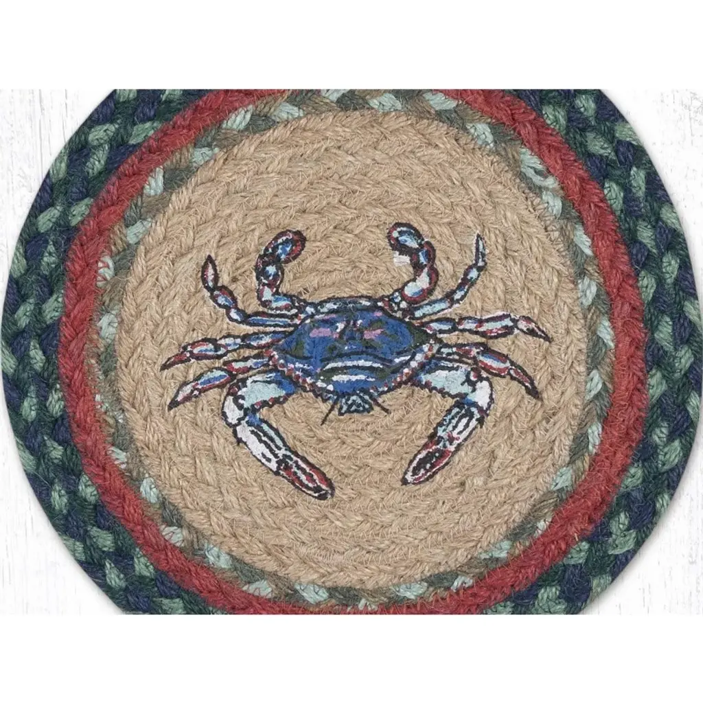 Earth Rugs Round Trivet – Blue Crab Printed Coastal Design, 10"x10", Braided Natural Jute