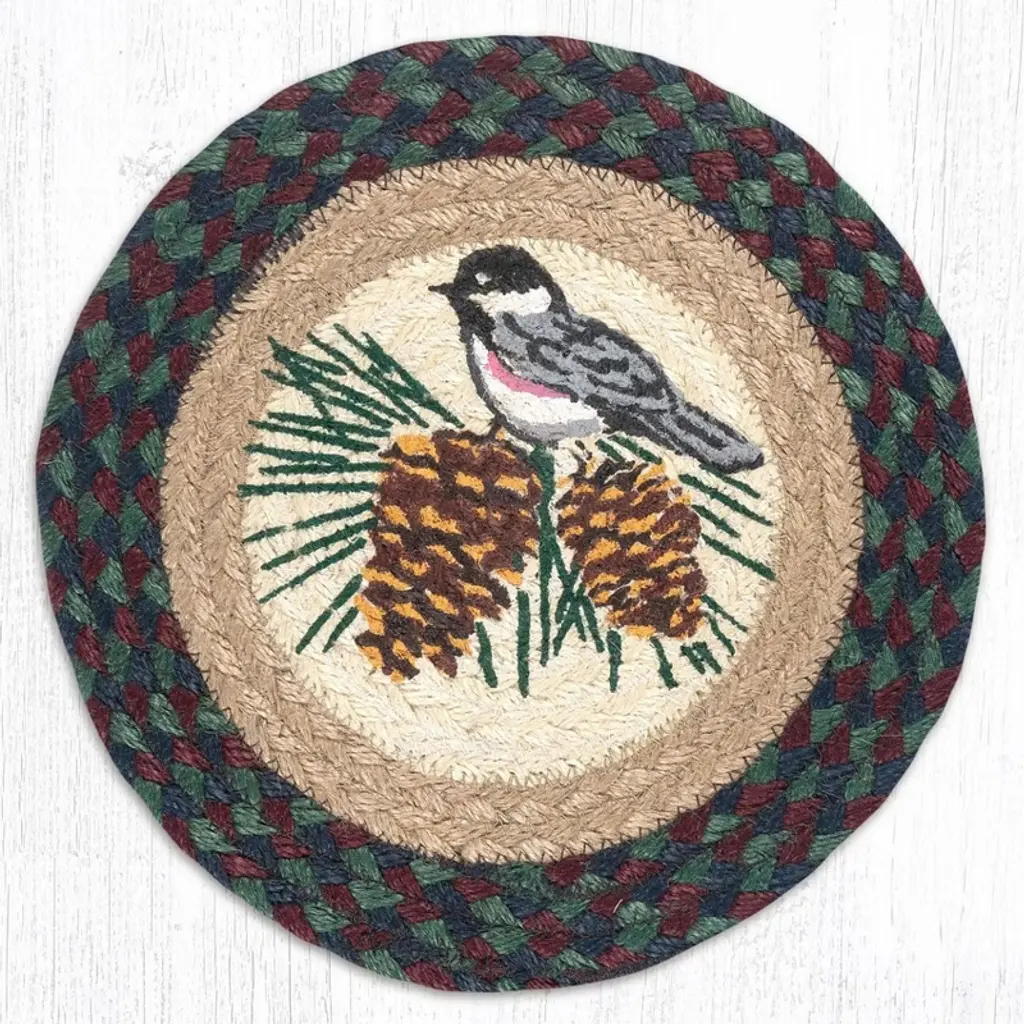 Earth Rugs Round Trivet – Chickadee Bird Print On Braided Jute, 10"x10", Rustic Nature-inspired Design