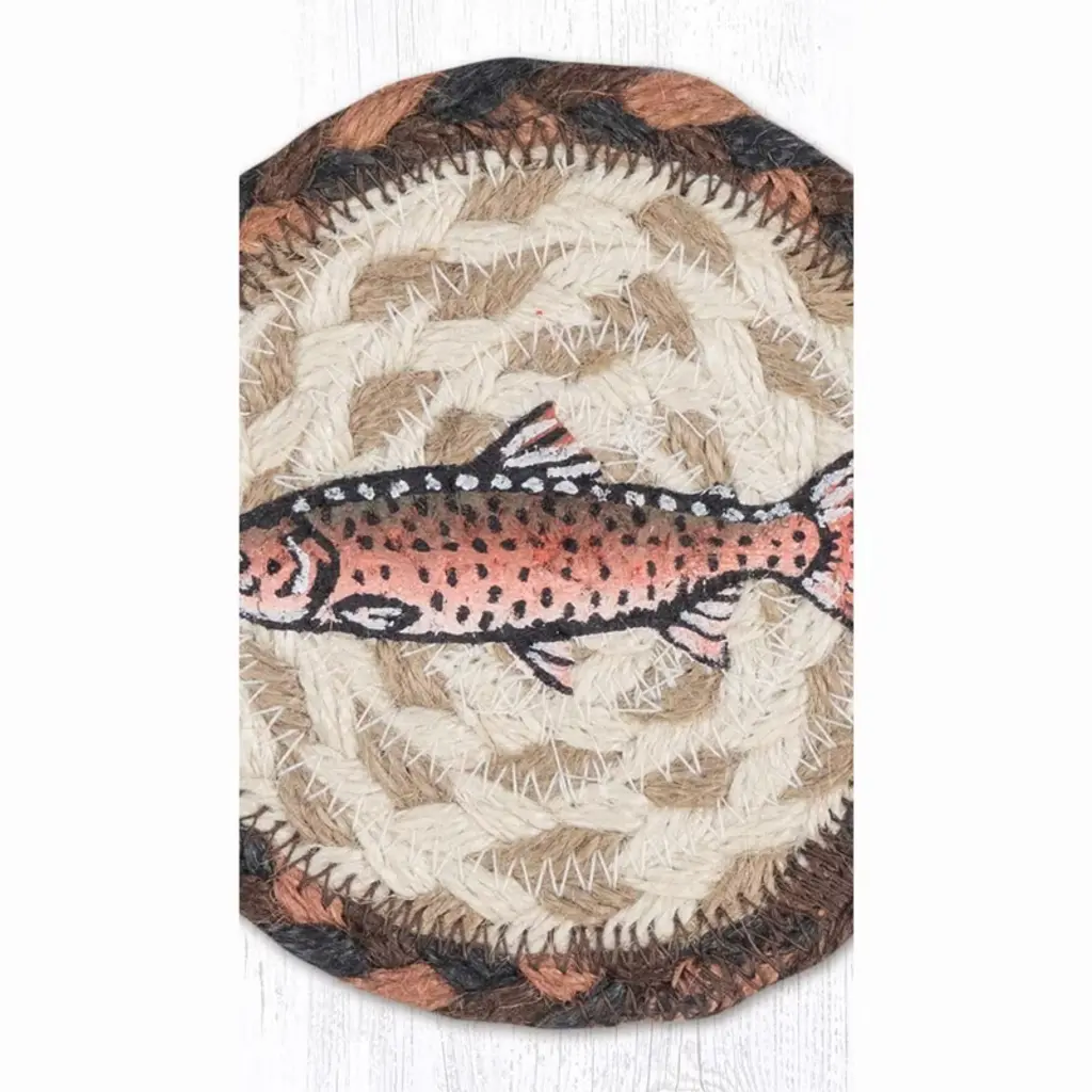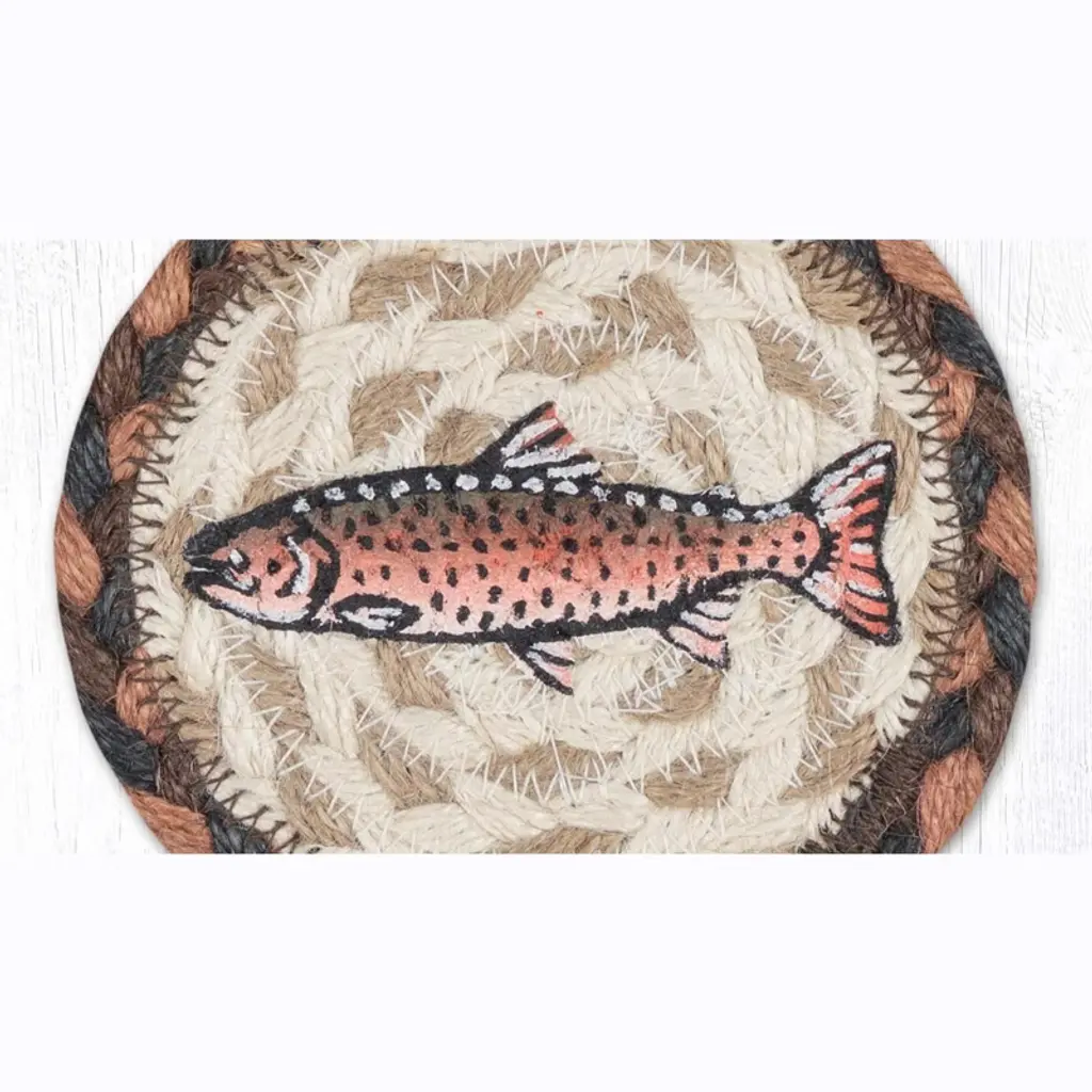 Bring the outdoors in with the Earth Rugs Red Salmon Printed Coaster. Featuring a vivid salmon design, this rustic square coaster is perfect for anglers, outdoor enthusiasts, and anyone who loves rustic lodge-inspired décor. Key Features: Showcase your love of fishing with this red salmon printed coasterCompact 5"x5" square size fits mugs, glasses, and small bowlsCrafted from eco-friendly braided jute with a detailed fish printProtects furniture from water marks, heat, and scratchesAdds rustic style to cabins, lodges, and farmhouse kitchensLow-maintenance design with easy spot-clean care